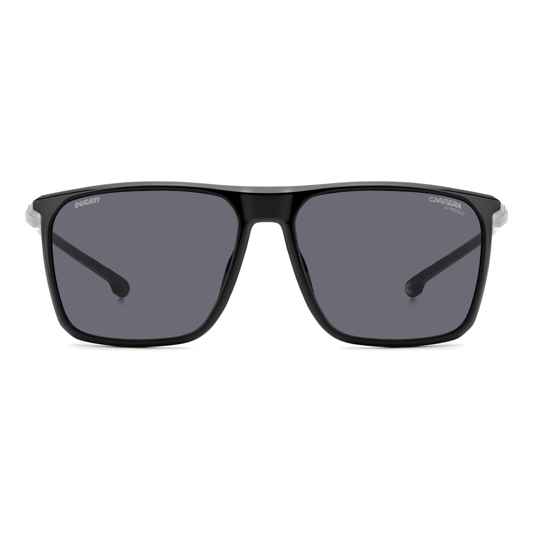 Wearing these Carrera | Ducati sunglasses is one way to be on-trend while also being part of the world of sport and speed. Their striking design arises from the square frames that are flat along the top. An accessory designed for performance: the slim, straight temples that extend into shiny rubber end tips ensure they fit easily under a helmet. Optimal vision is guaranteed by the lenses, which come in mirrored or ultrapolar options. Alternatively, the frames can be fitted with prescription lenses.