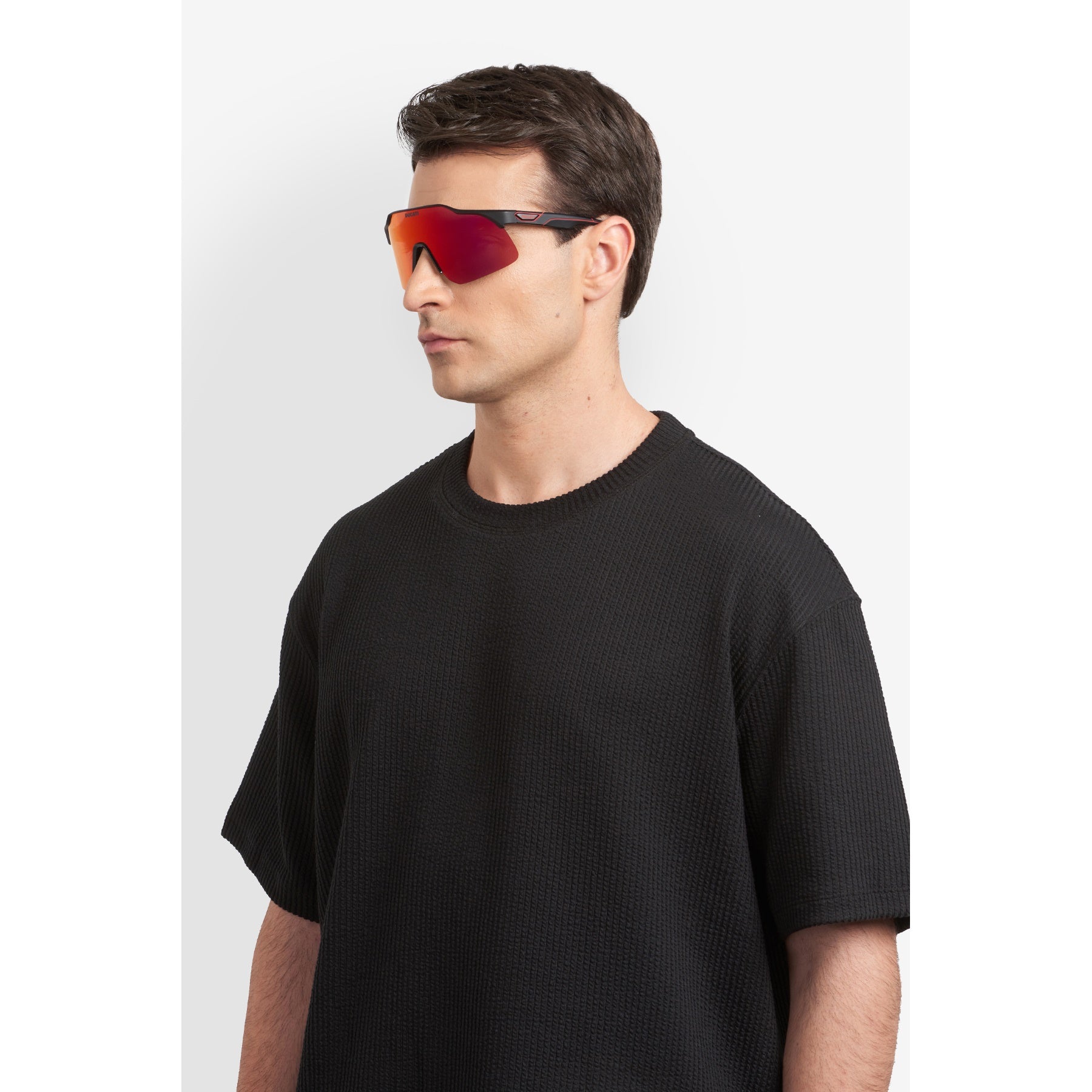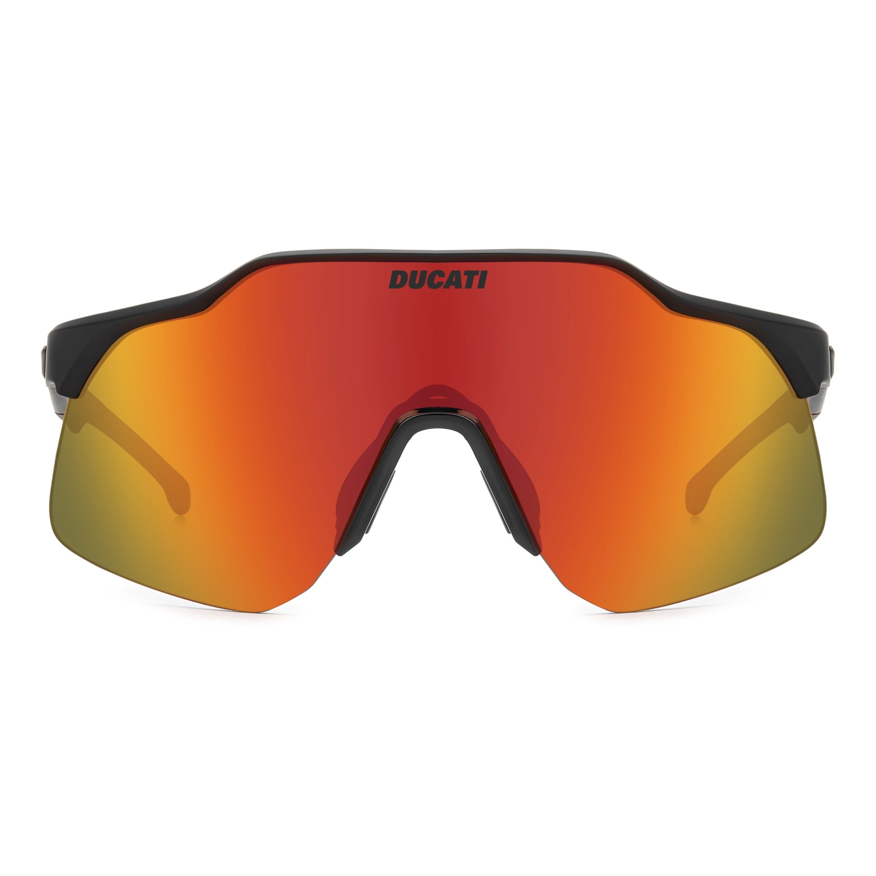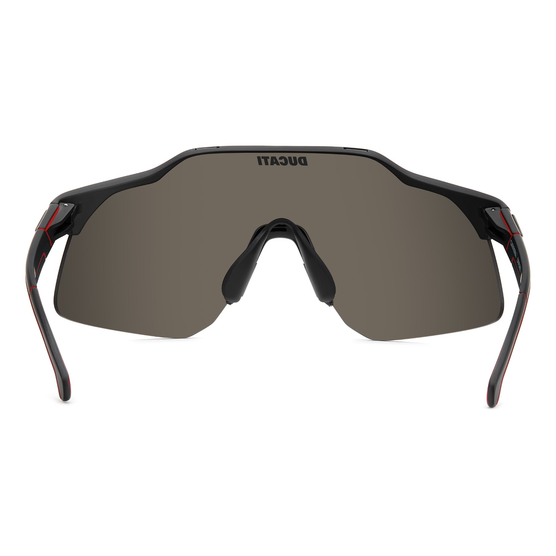 These Carrera | Ducati sunglasses are made for those who dare to stand out, on the racetrack or in everyday life. The sporty maxi shield lens features a half-rim front with adjustable nose pads. Clear logos appear front and centre, plus plaques on the temple which match Ducati's technically advanced aerodynamic engineering. Available with mirrored lenses for performance that can't be beat.