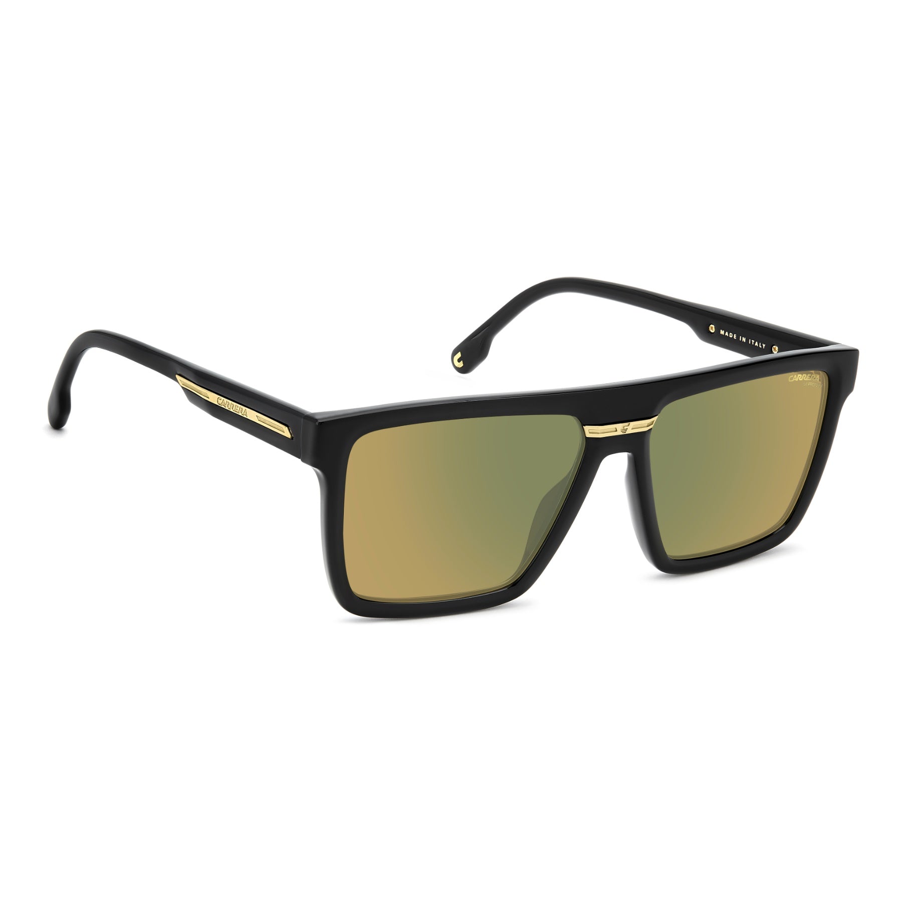 Faithful to Carrera style, these Made in Italy sunglasses are a masterpiece of design and craftsmanship. The frames with a flat topline are exalted by a plaque with the Carrera flag and the iconic ‘C’, in a strategic and innovative horizontal position. The sculpted temples with a prominent logo are noteworthy. Made to be worn without hesitation, this style includes options with mirrored or polarized lenses. These glasses can be fitted with prescription lenses.