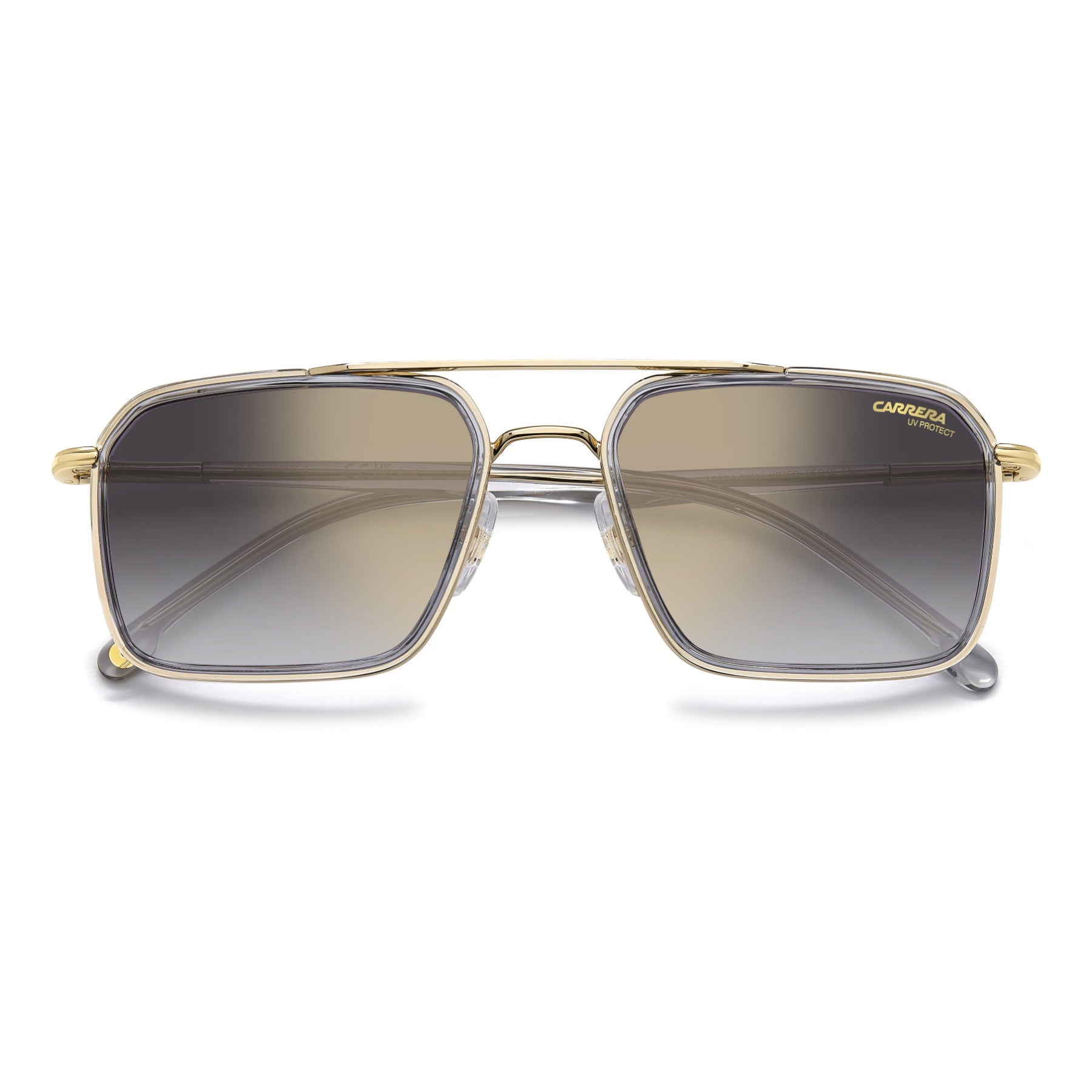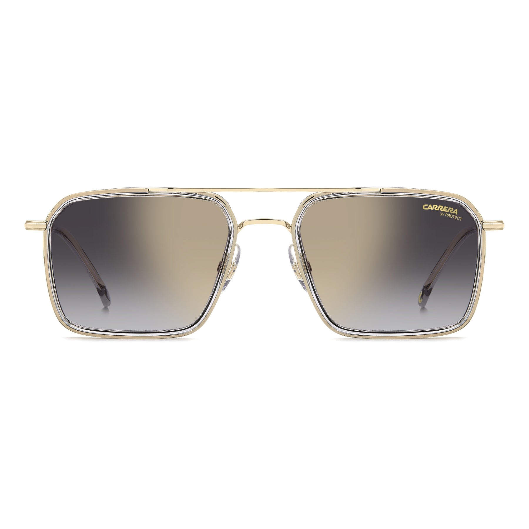These Carrera sunglasses blend a traditional shape with a modern attitude. The stainless steel structure meets acetate profiles on the front and temples in a captivating material mix that balances their essential design. This style comes with flex hinges and adjustable nose pads. Choose between gradient, mirrored, ultrapolar or photochromic lenses.