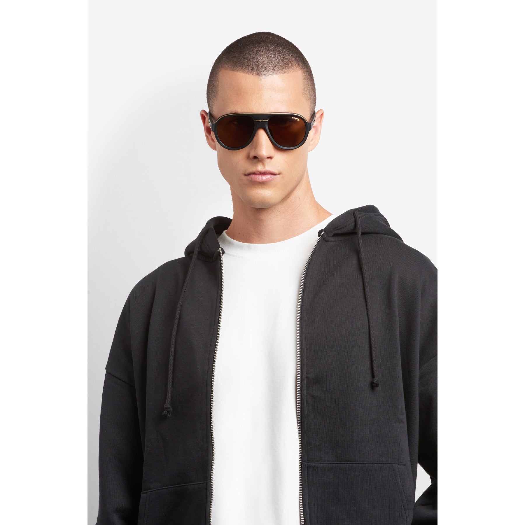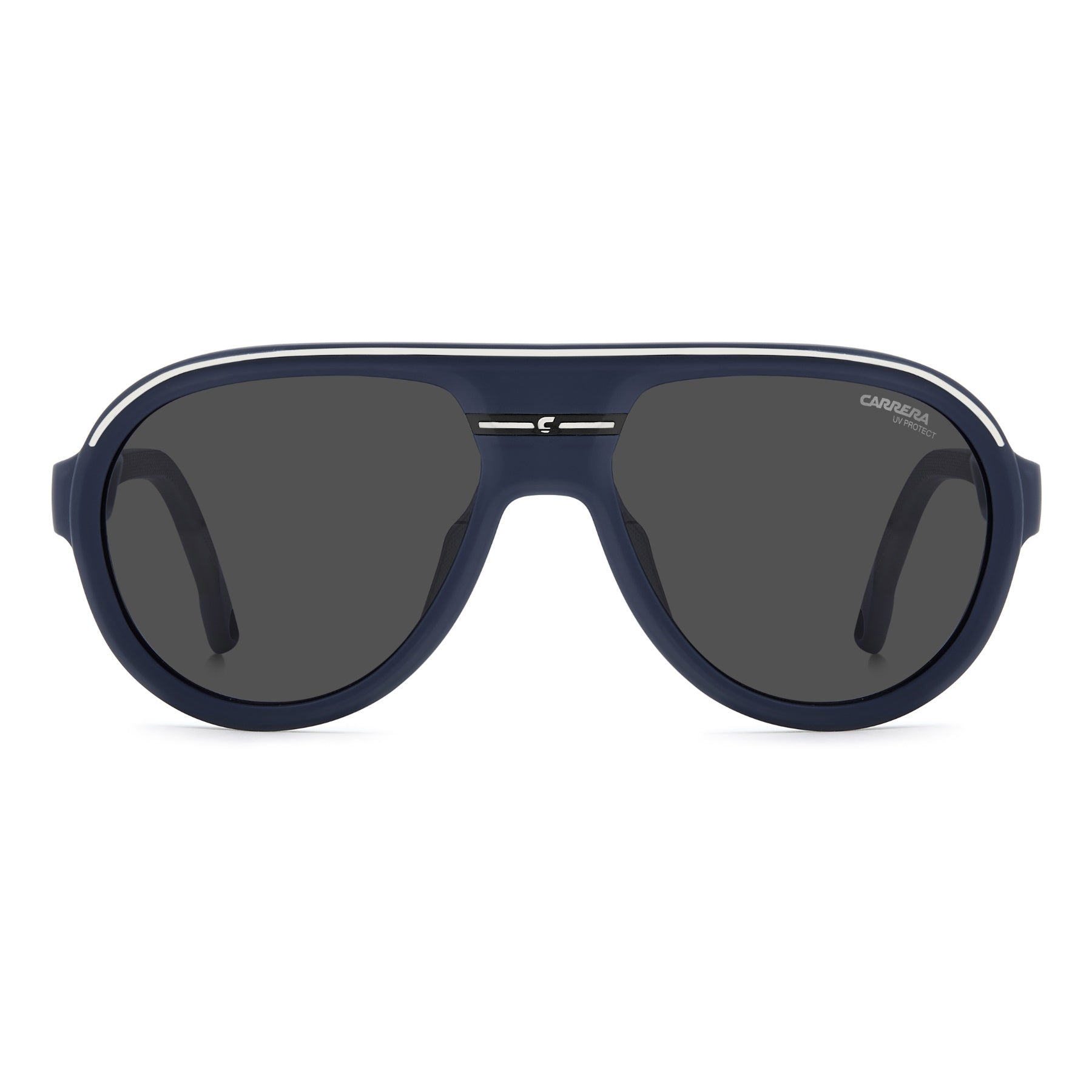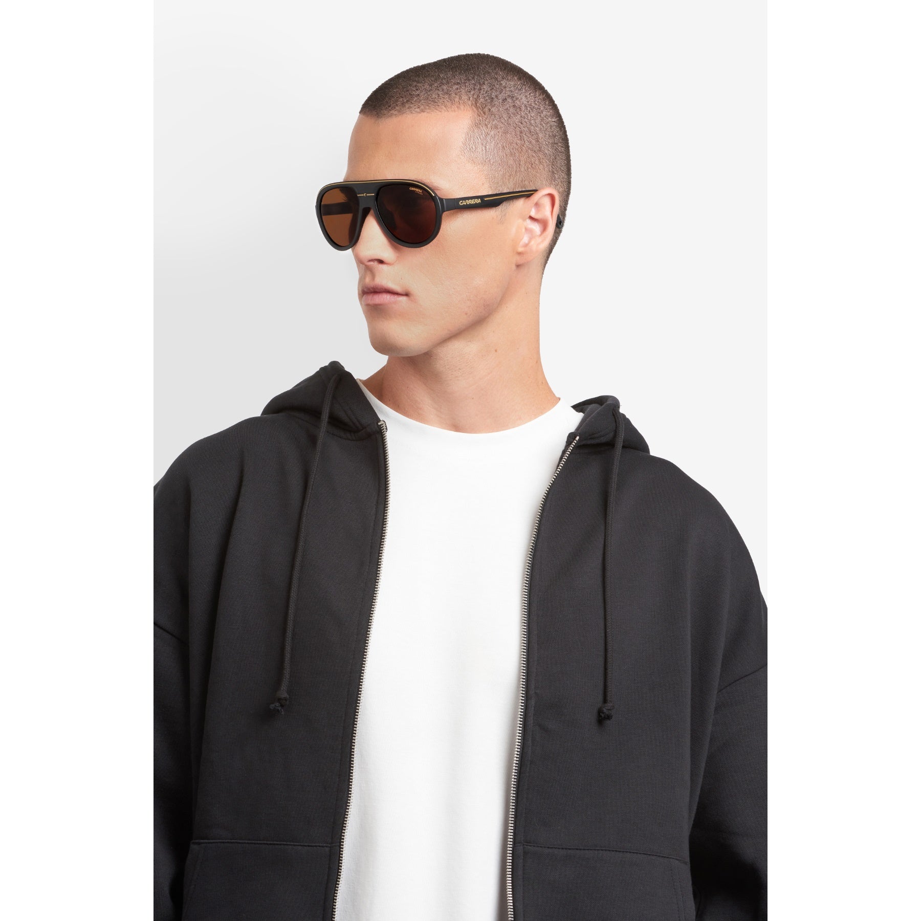 These Carrera sunglasses revisit an emblematic design from the brand's sporty heritage, echoing looks from the 1980s, when Carrera set fashion trends on the world's most exclusive slopes. The plastic aviator front features the Victory C logo placed horizontally and lateral magnets for optional spoilers. Rubber inserts on the temples ensure comfort while adjustable end tips with holes can be paired with an optional elastic band.