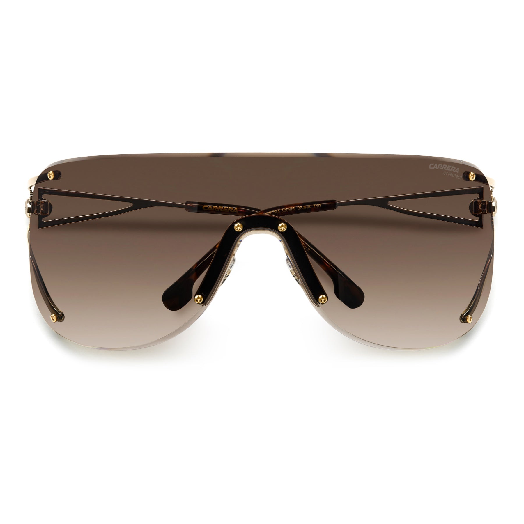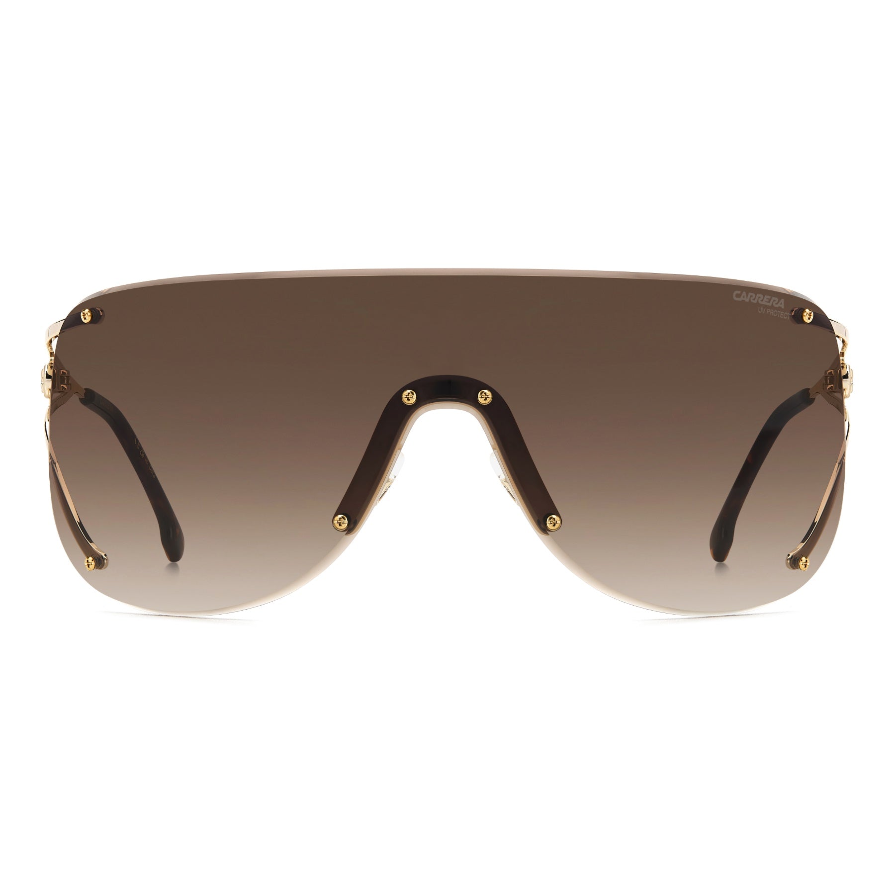 These Carrera women’s sunglasses are sure to be adored by true fans of the brand. The rimless shield front adds must-have wow-factor: a single, full-coverage lens, decorated by visible screws that are both functional and decorative. The temples are fine-design gems, with a forked silhouette connected by a suspended logo. This style comes in an elegant range of contemporary colours.