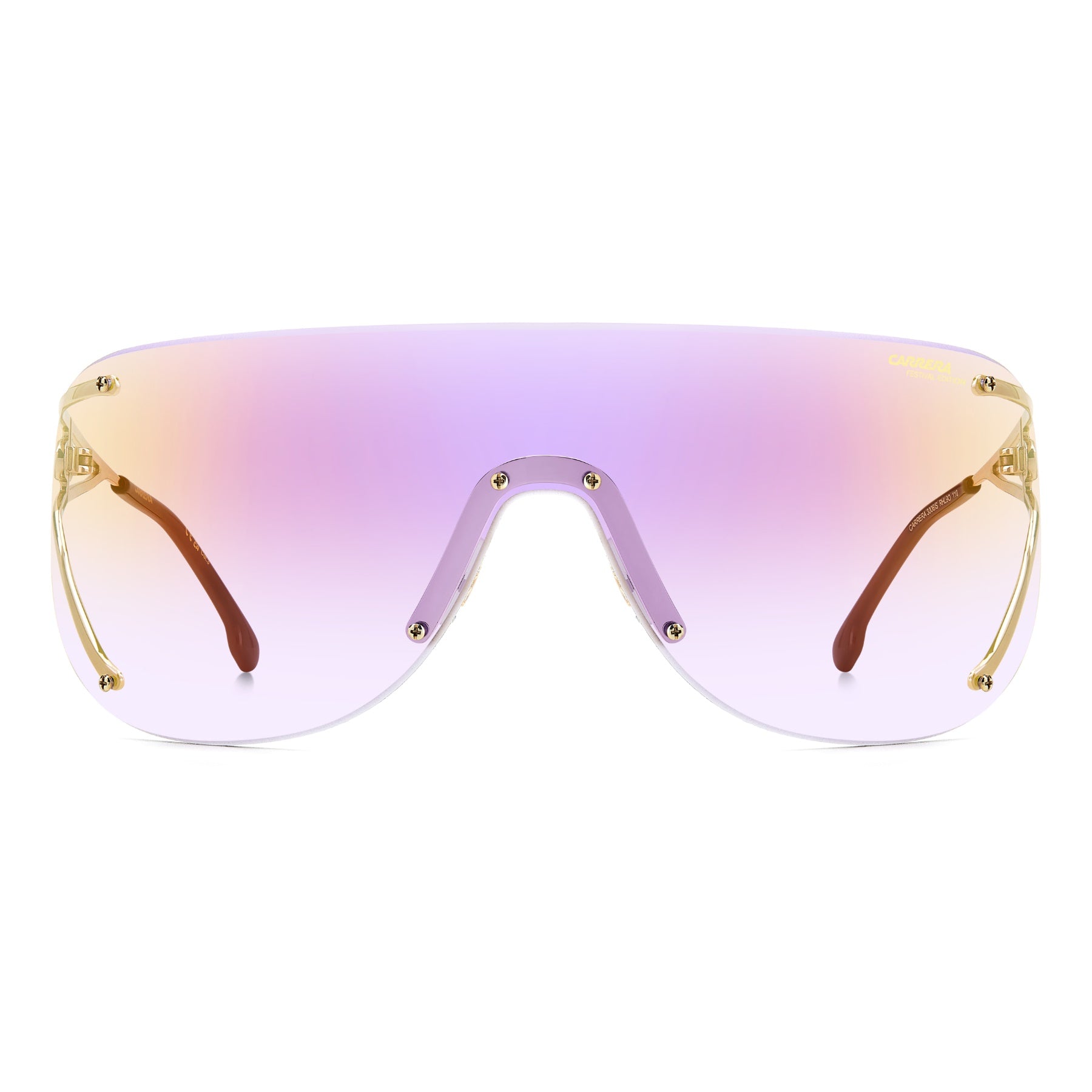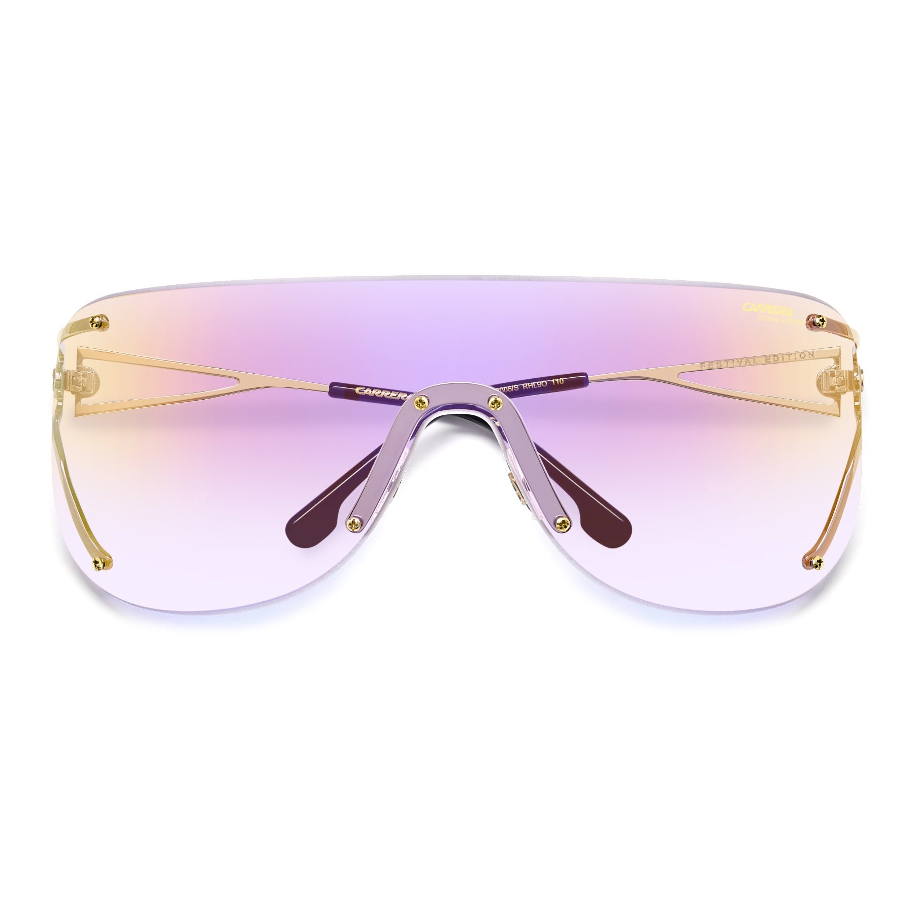 These Carrera women’s sunglasses are sure to be adored by true fans of the brand. The rimless shield front adds must-have wow-factor: a single, full-coverage lens, decorated by visible screws that are both functional and decorative. The temples are fine-design gems, with a forked silhouette connected by a suspended logo. This style comes in an elegant range of contemporary colours.