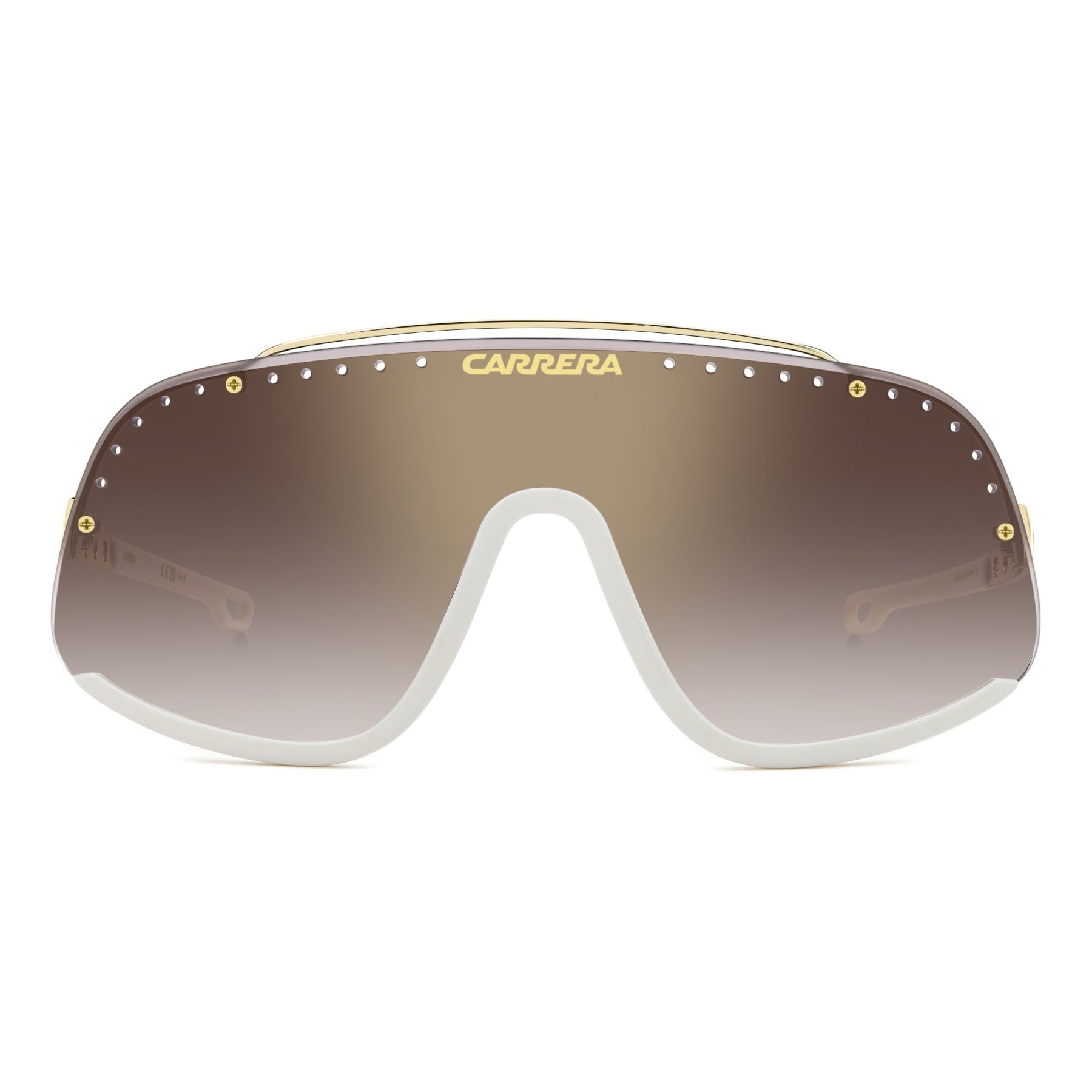 The racing spirit of Carrera is expressed in these unisex sunglasses. The shield front is topped by a slender metal top bar, completed by decorative screws and round venting. The metal temples also feature round openings, echoing in the design of the steering wheels of the classic cars that once raced in the Carrera Panamericana. Some versions have mirrored lenses, including an orange variant for a vintage look. This collector's item comes with its own special packaging.