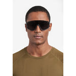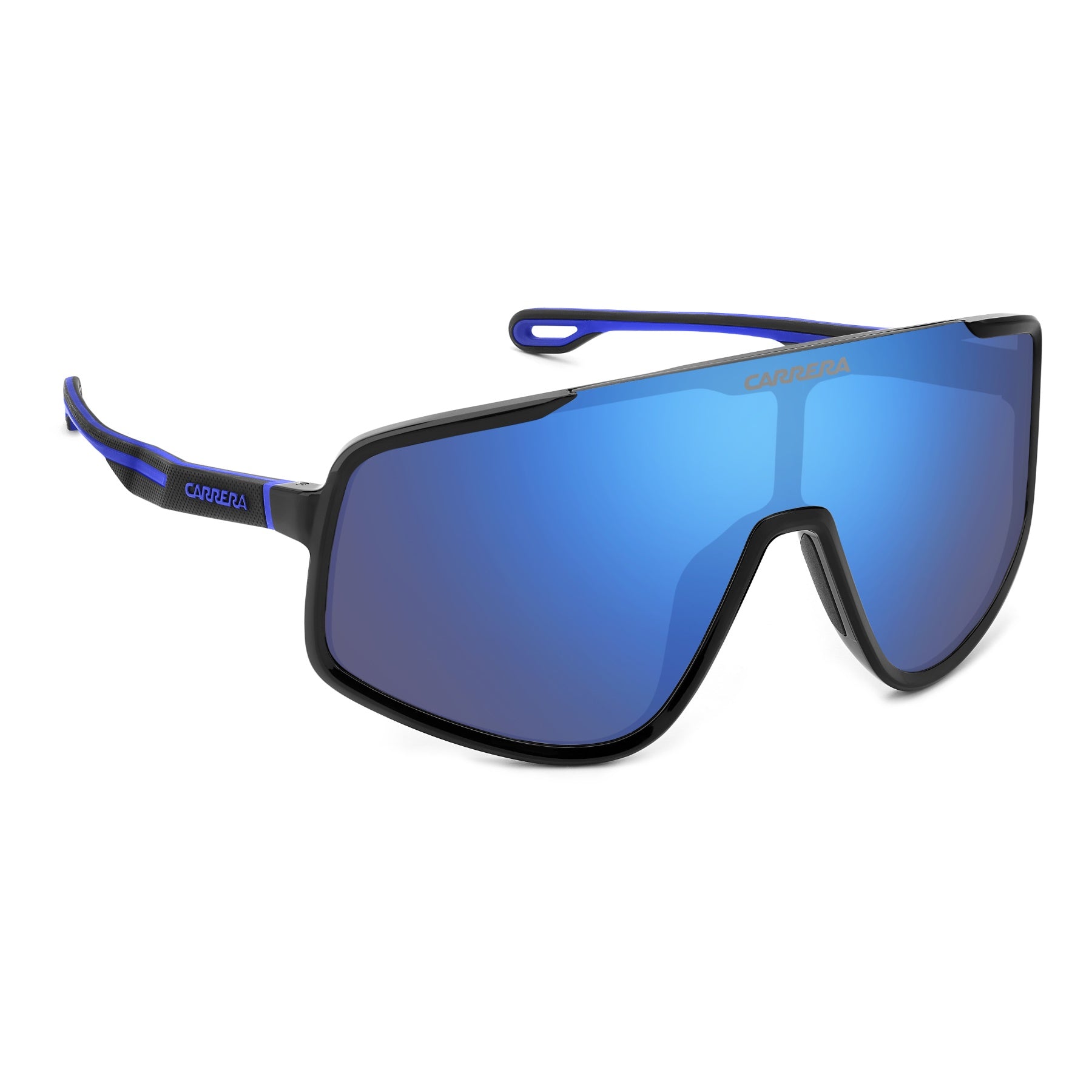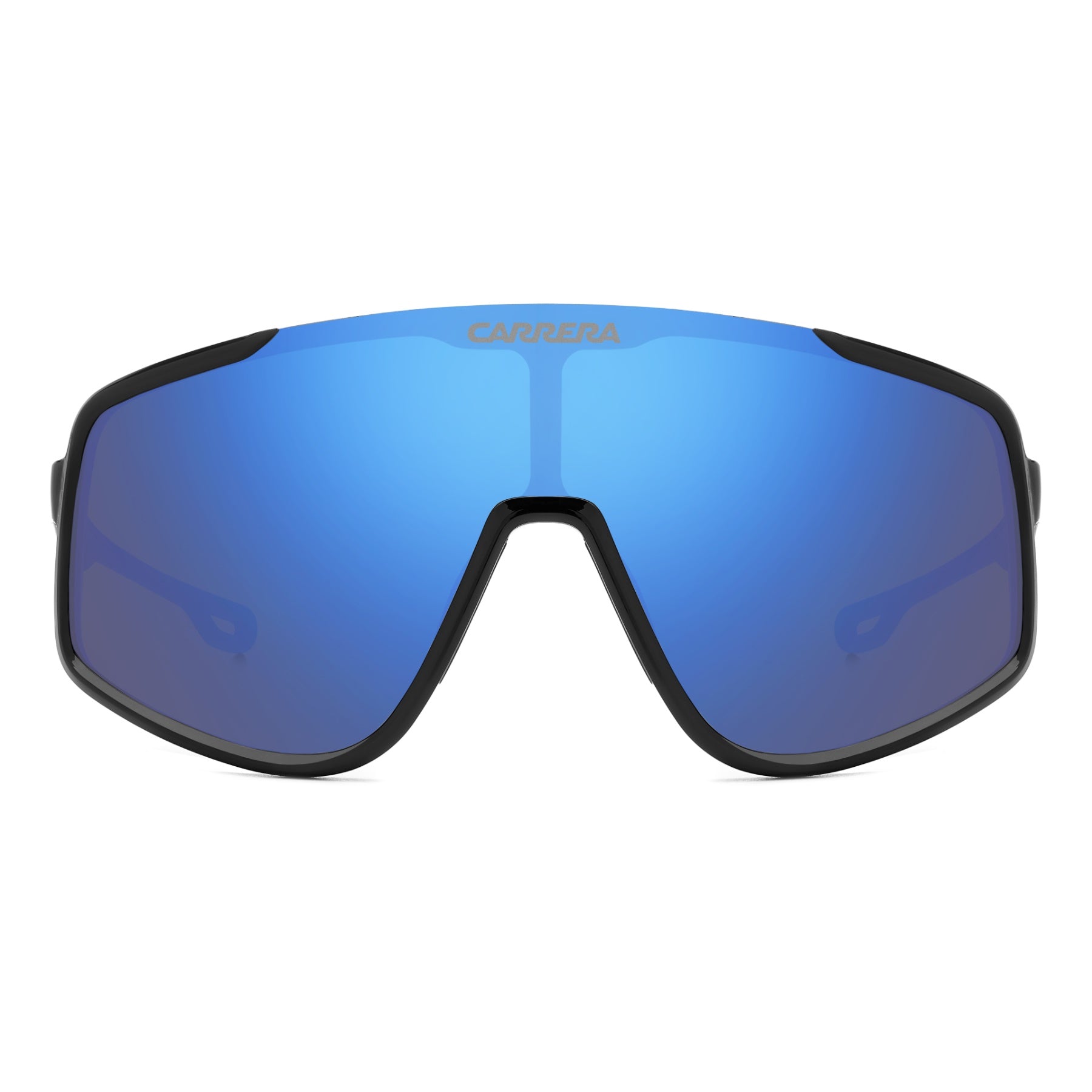 These Carrera sunglasses are sporty and high-performance. The maxi shield lens is captivating, whether standard or mirrored, and is held in place by a single frame that is open along the top. The two-tone temples are equally alluring, with a slightly folded shape. They're injection-moulded in two materials and colours, with rubber inserts that create the famous Carrera flag. The holes on the end tips were inspired by active lifestyles, while the Carrera logo ensures a place in the fashion limelight.