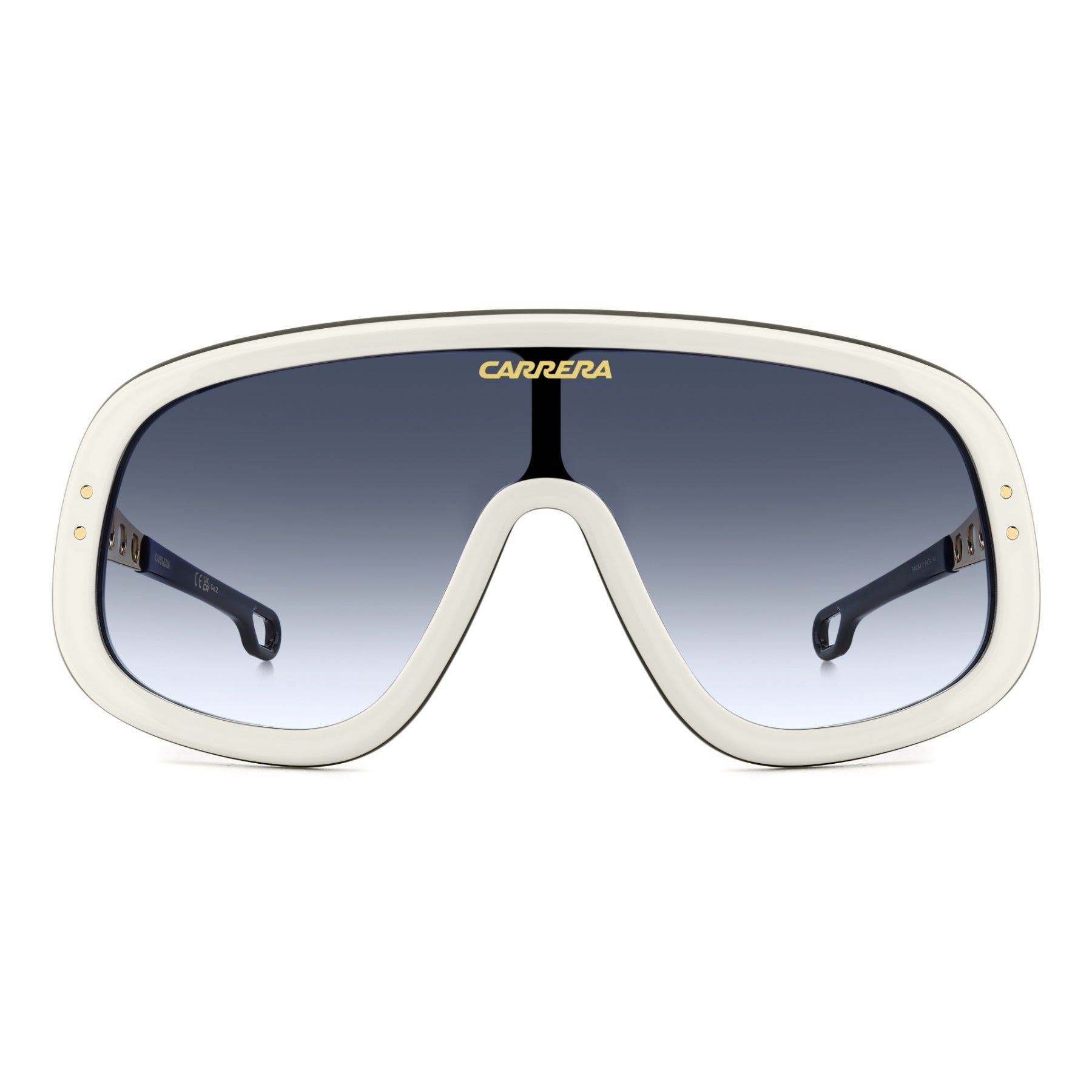These Carrera sunglasses bring a sporty attitude to fashion. The shield front is profiled by acetate, printed with a logo on the lens. The temples are a true gem: their round vents echo the design of the steering wheels on the classic cars which raced in the Carrera Panamericana. Versions with yellow or orange lenses give rise to a truly evocative look. This collector's item comes with its own special packaging.
