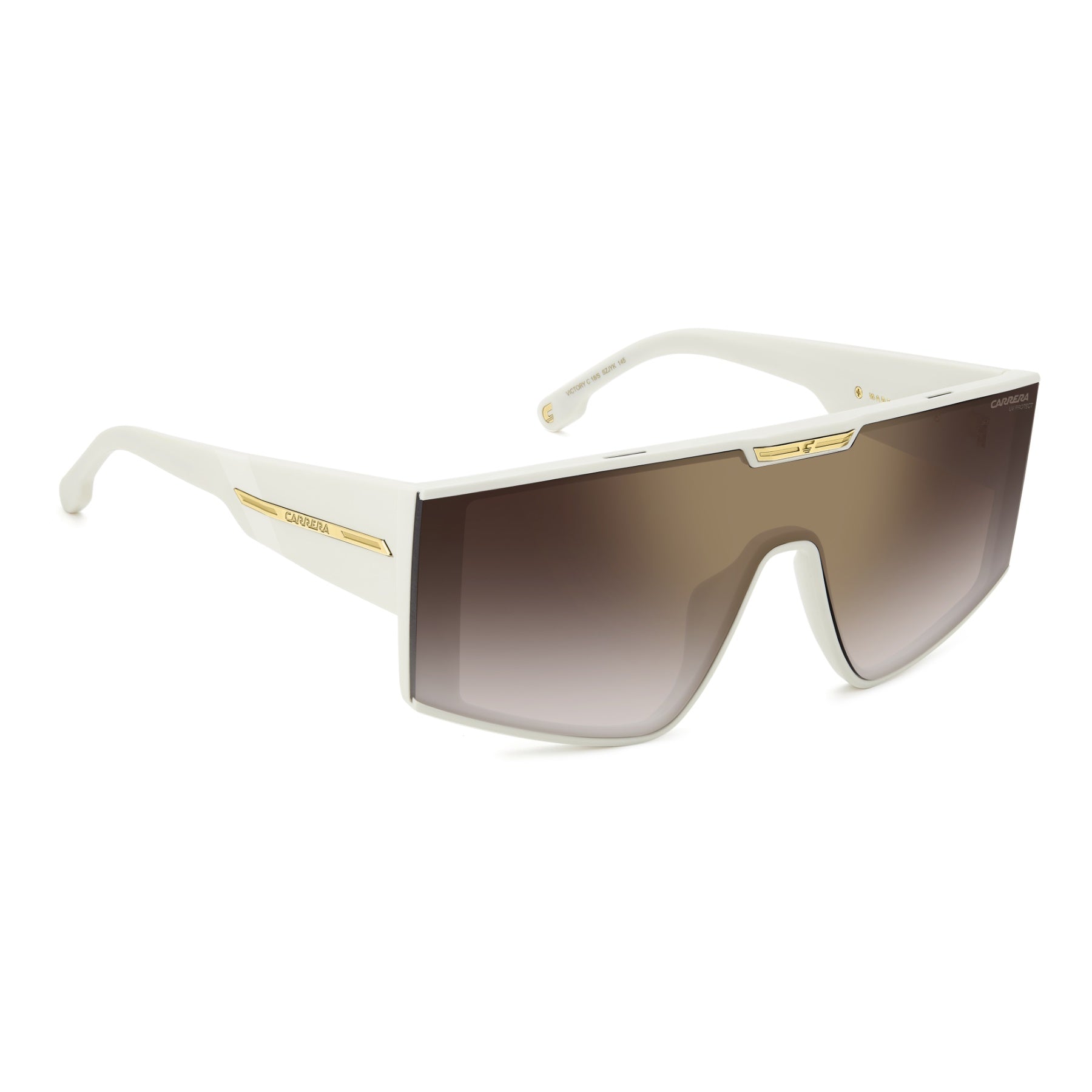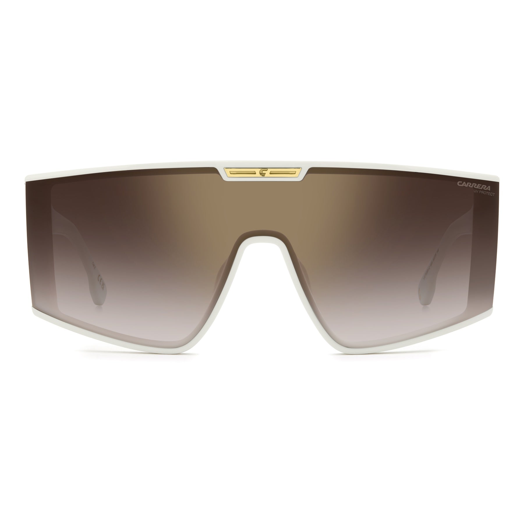These Carrera shield sunglasses are made to stand out. The single-lens front is striking, especially in the mirrored version. A metal plaque with the brand’s C logo sits at the centre top, repeated on the oversized temples that match Carrera’s bold personality. Made in Italy, they come in different colours, including a transparent option.