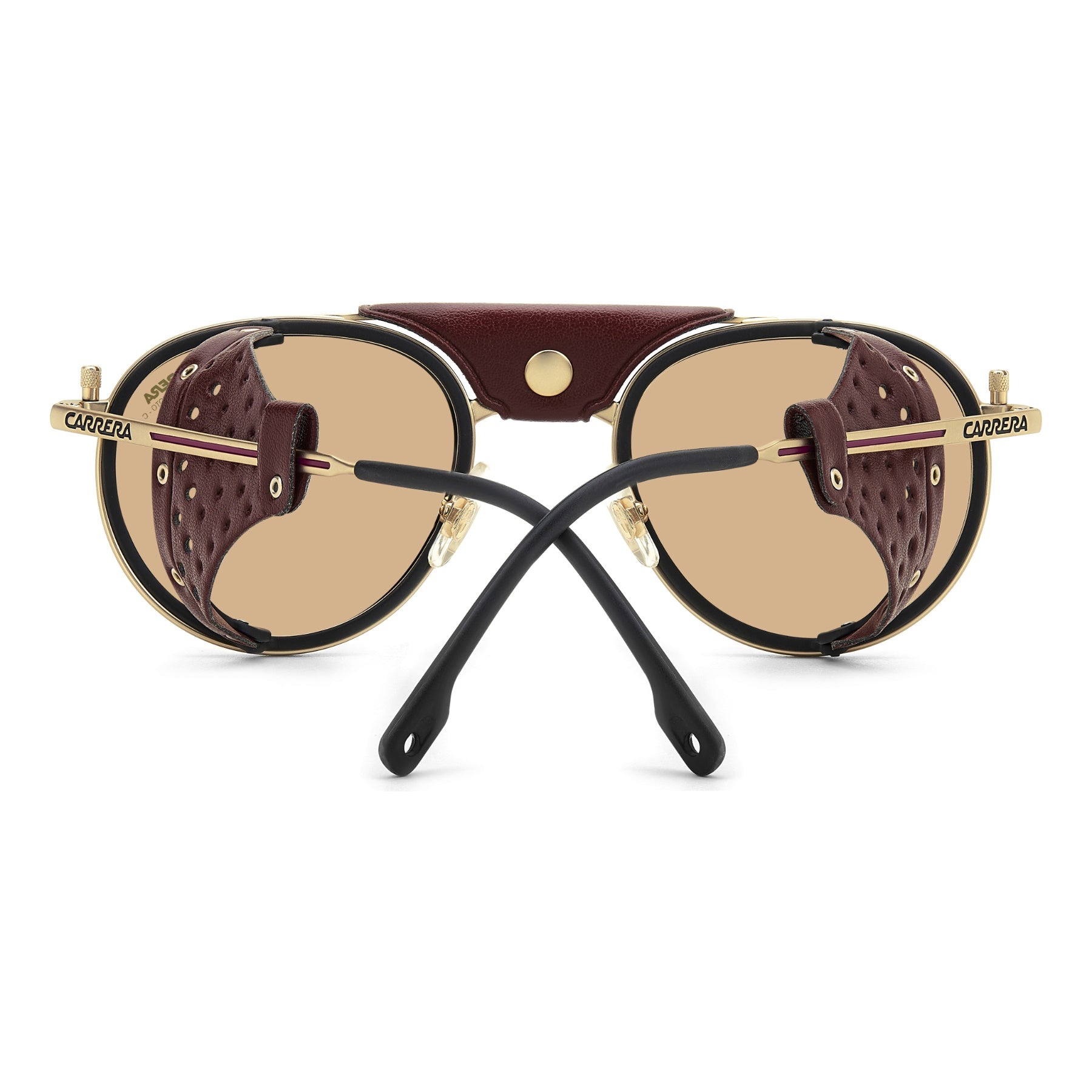 These Carrera sunglasses were inspired by Alpine landscapes. The metal structure is accompanied by detachable faux leather elements on the sides and double bridge which protect from the light and wind. The end tips can be adjusted, remaining solidly in place thanks to their curved shape. Dedicated openings make it possible to attach an elastic cord which can be purchased separately, so as not to lose them on the most arduous climbs. This style is available in mirrored or photochromic lens versions.