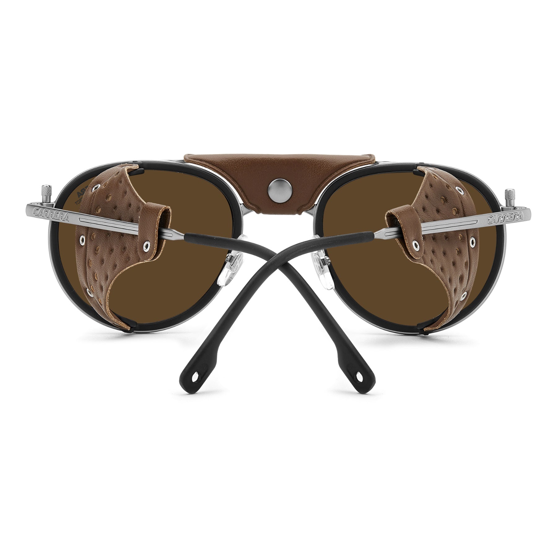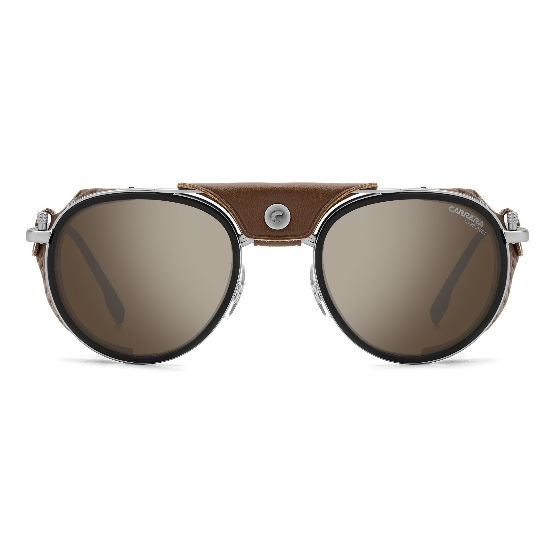 These Carrera sunglasses were inspired by Alpine landscapes. The metal structure is accompanied by detachable faux leather elements on the sides and double bridge which protect from the light and wind. The end tips can be adjusted, remaining solidly in place thanks to their curved shape. Dedicated openings make it possible to attach an elastic cord which can be purchased separately, so as not to lose them on the most arduous climbs. This style is available in mirrored or photochromic lens versions.