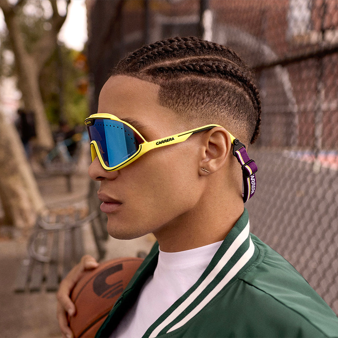These special-edition Carrera sunglasses feature a shield front with air holes, celebrating the brand's sporty heritage. An innovative magnetic system lets you remove the temples and replace them with a branded elastic band, transforming this iconic style into snow goggles.