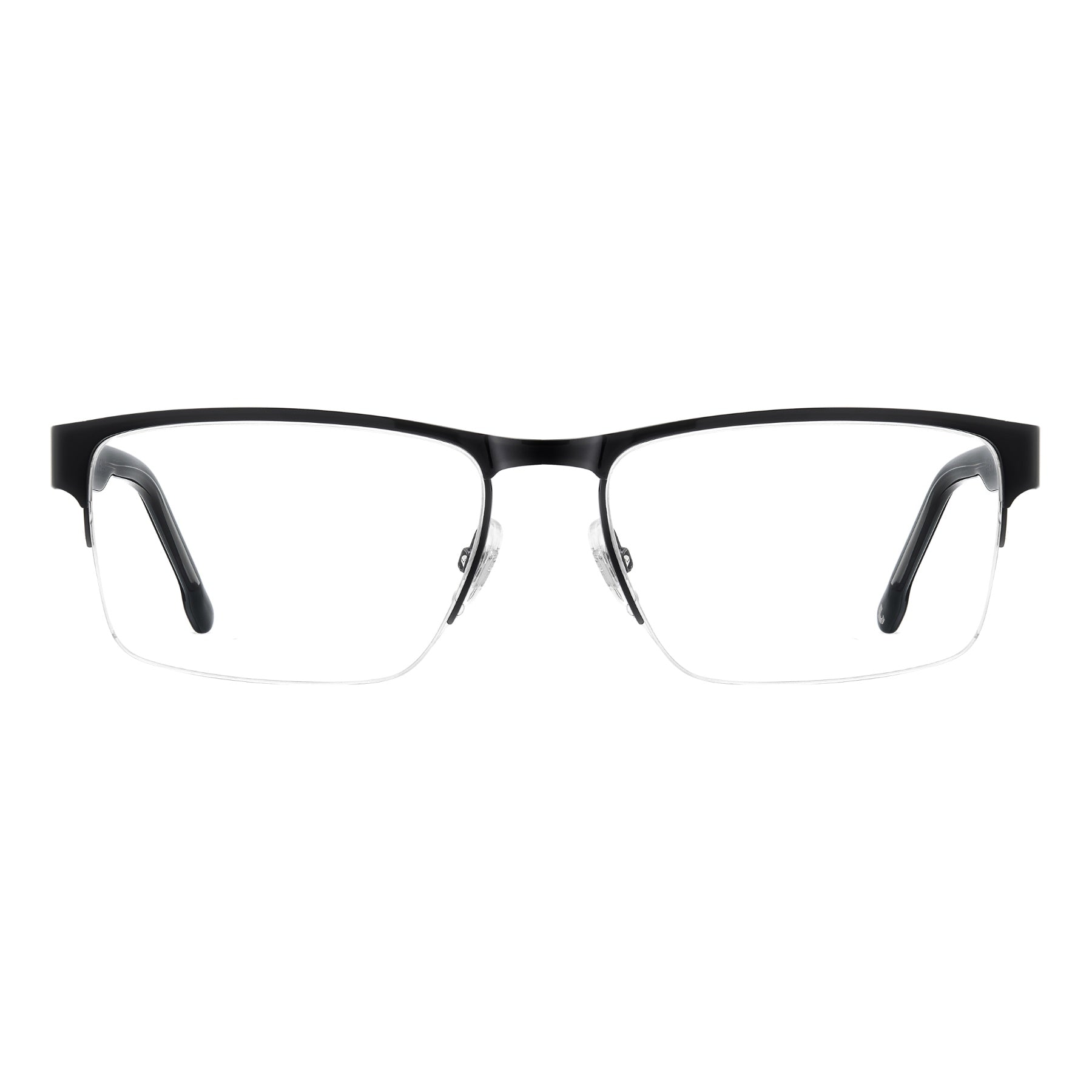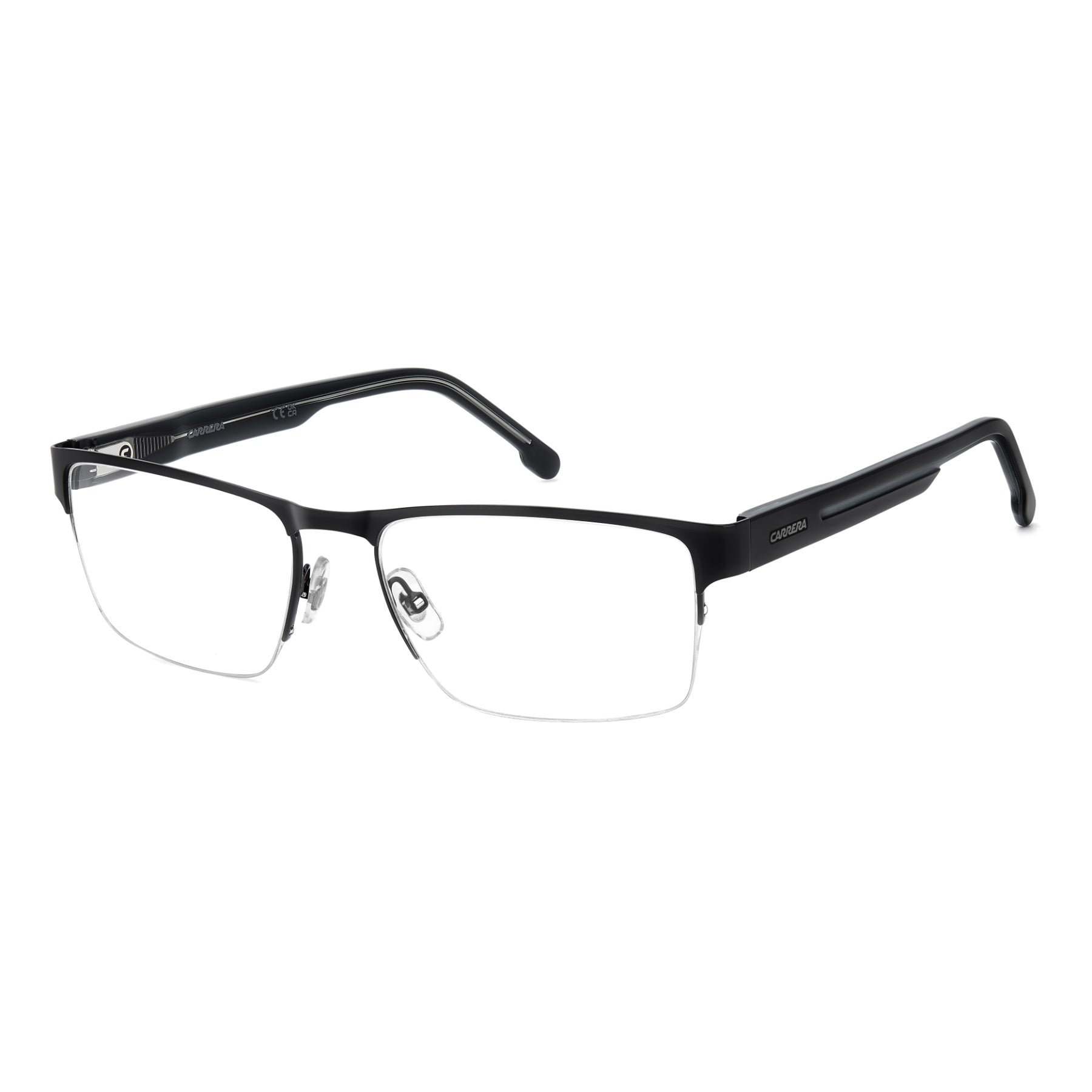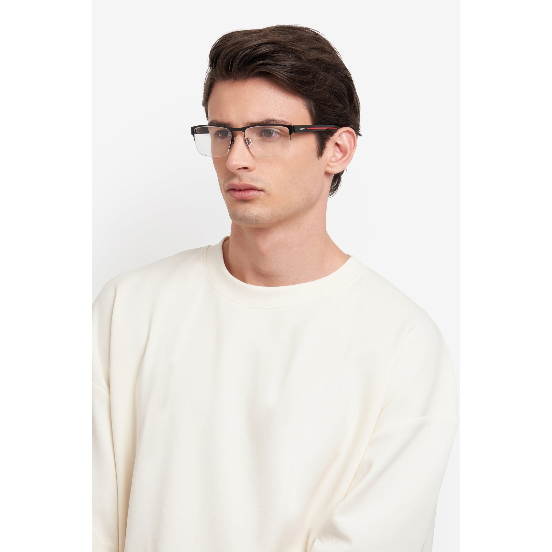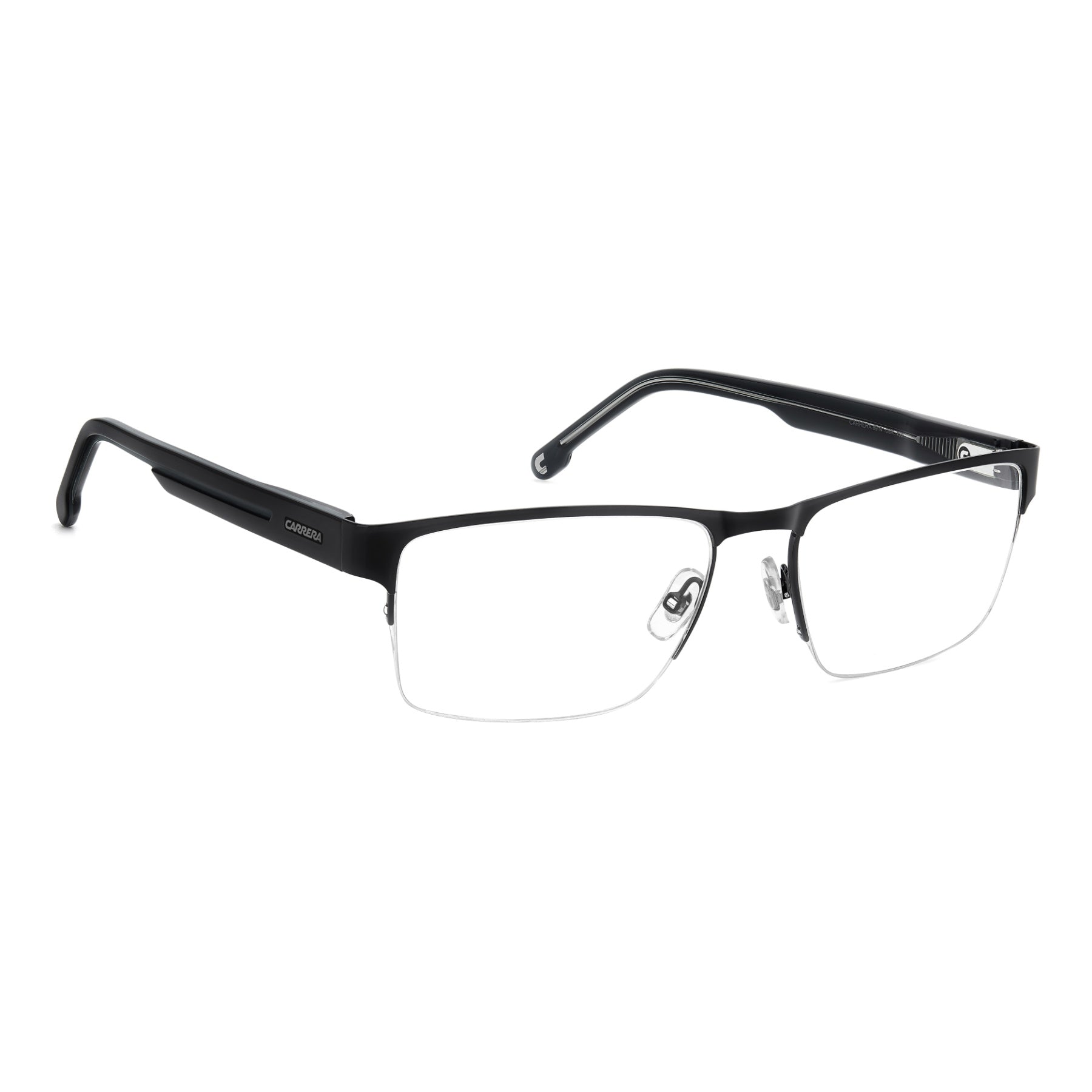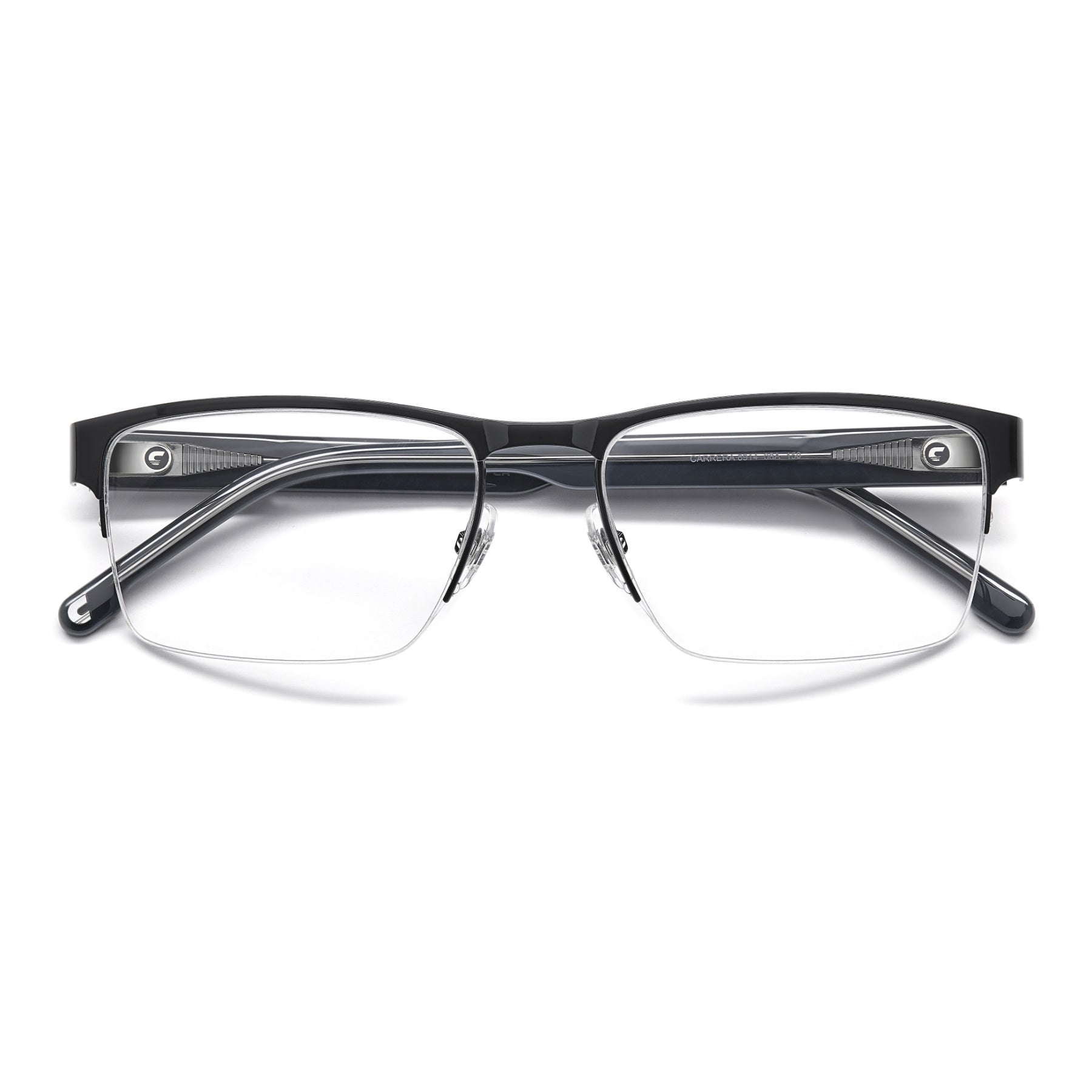 Carrera takes comfort and versatility very seriously: the result is this pair of eyeglasses with half-rim frames. Adjustable nose pads, flexible hinges and the option to choose between two lens sizes ensure a personalised fit. Newly designed acetate temples, which have been sculpted to reference the Carrera flag, define this style. The accents are either tone-on-tone, blue or in the quintessential Carrera hue: red.