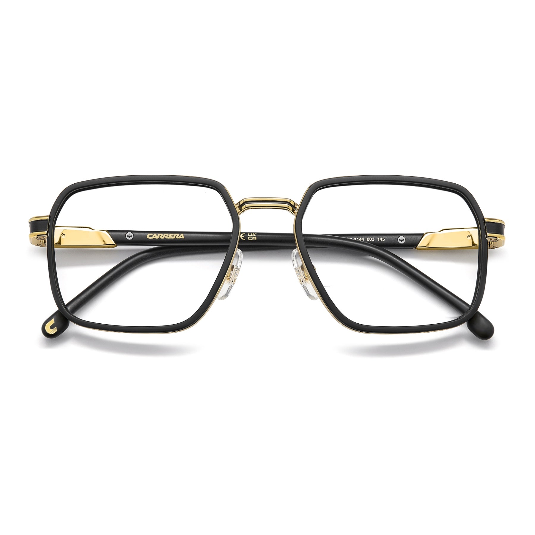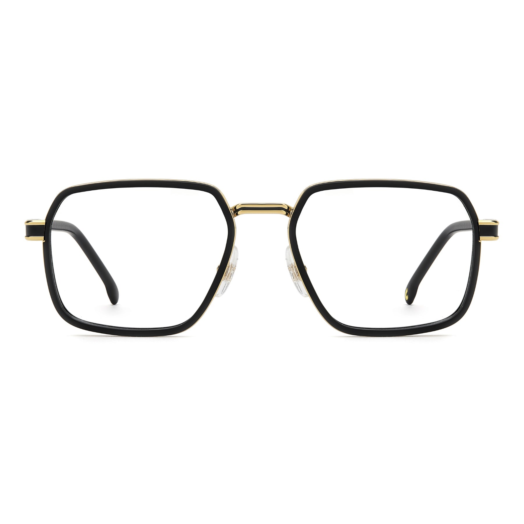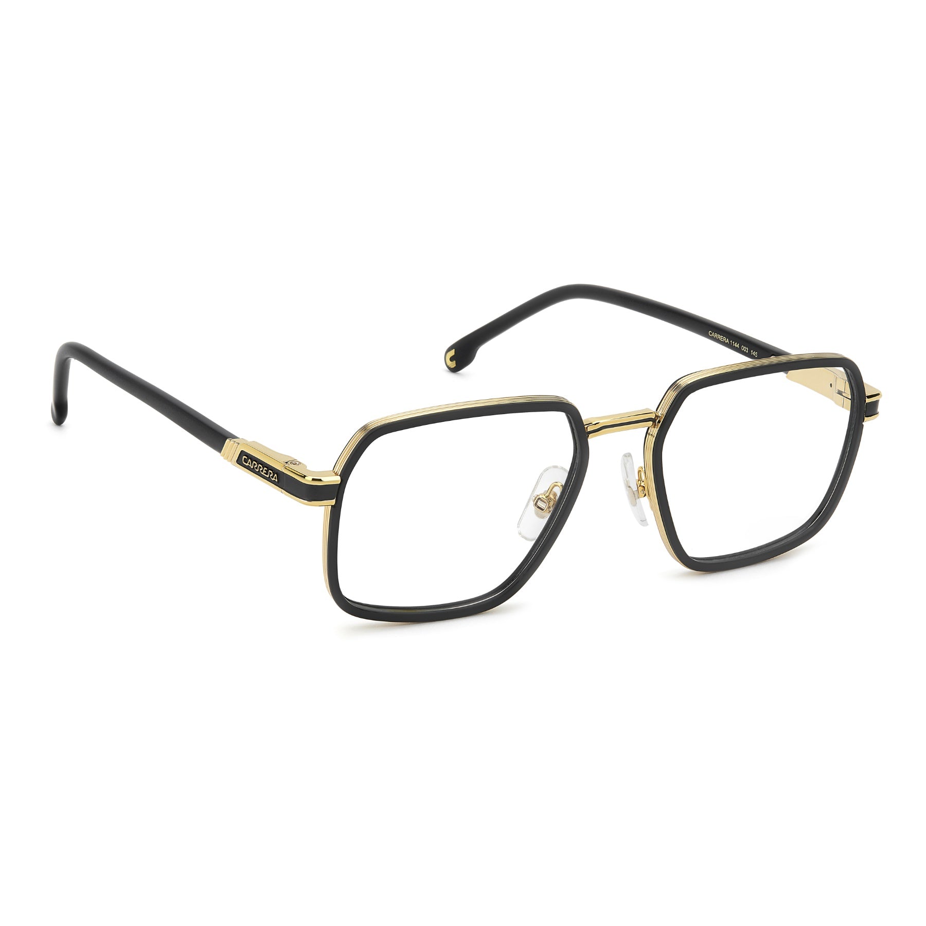 These Carrera eyeglasses deliver an unforgettable look. The geometric frames pair perfectly with sculpted temples, true icons of Carrera eyewear. A bold mix of stainless steel and plastic materials creates modern, daring style. Made for everyday wear, they feature flex hinges and adjustable nose pads. Choose from classic black and gold, transparent with a visible core, or marble-effect details on the inner temples.
