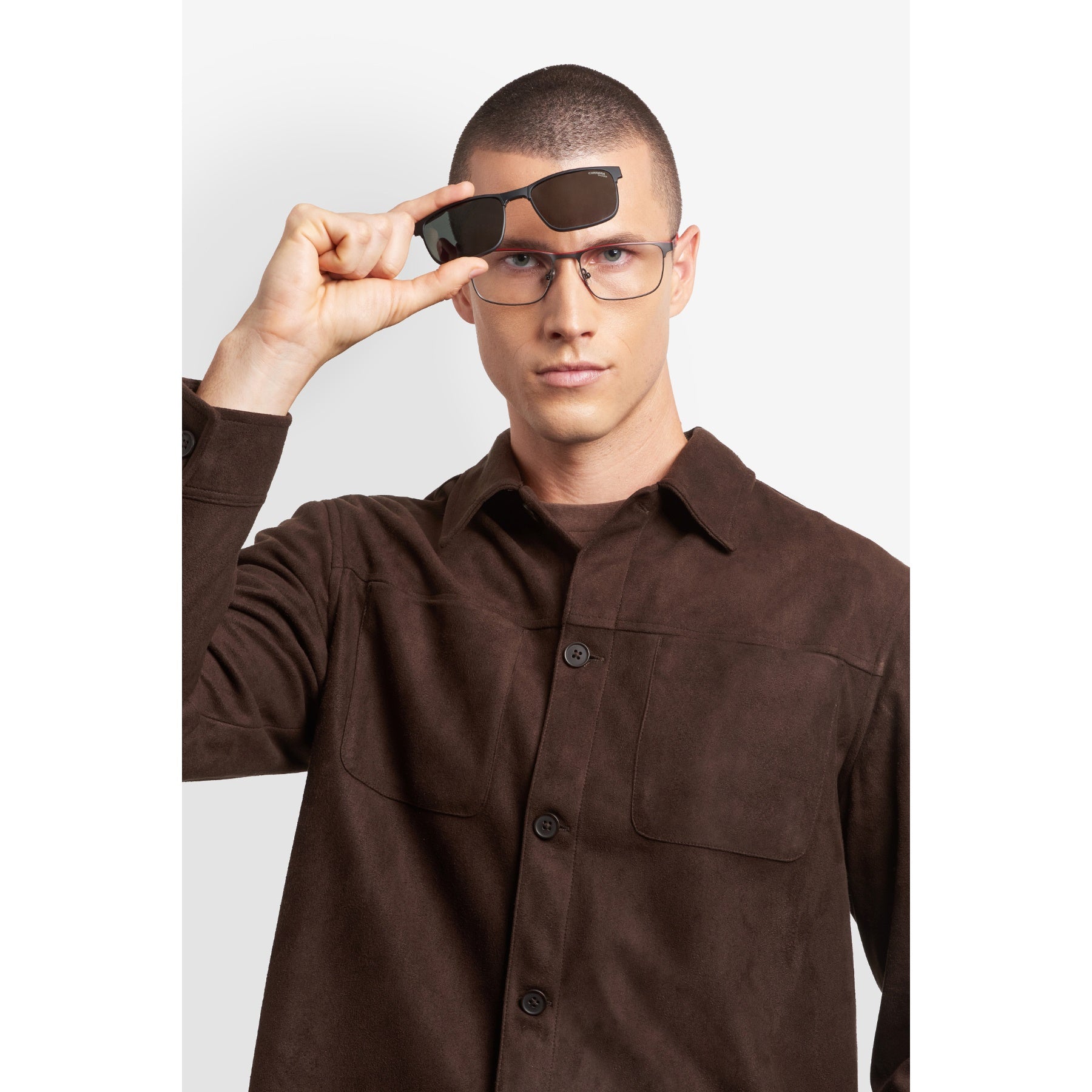 These Carrera optical glasses combine function and style. The front is made of stainless steel, with one version featuring an accent along the top in a different hue. Rubber inserts and the Carrera logo on the temples add a casual touch. Clip-on polarized sun lenses offer maximum freedom. They fold easily and attach with a simple click.