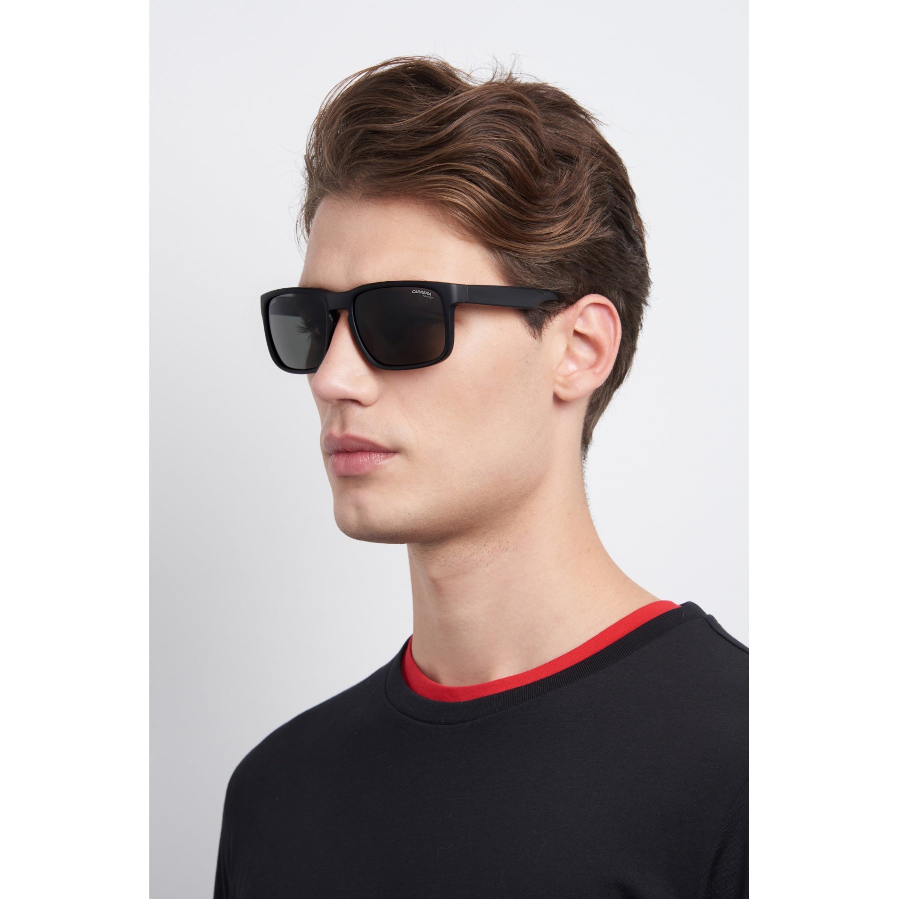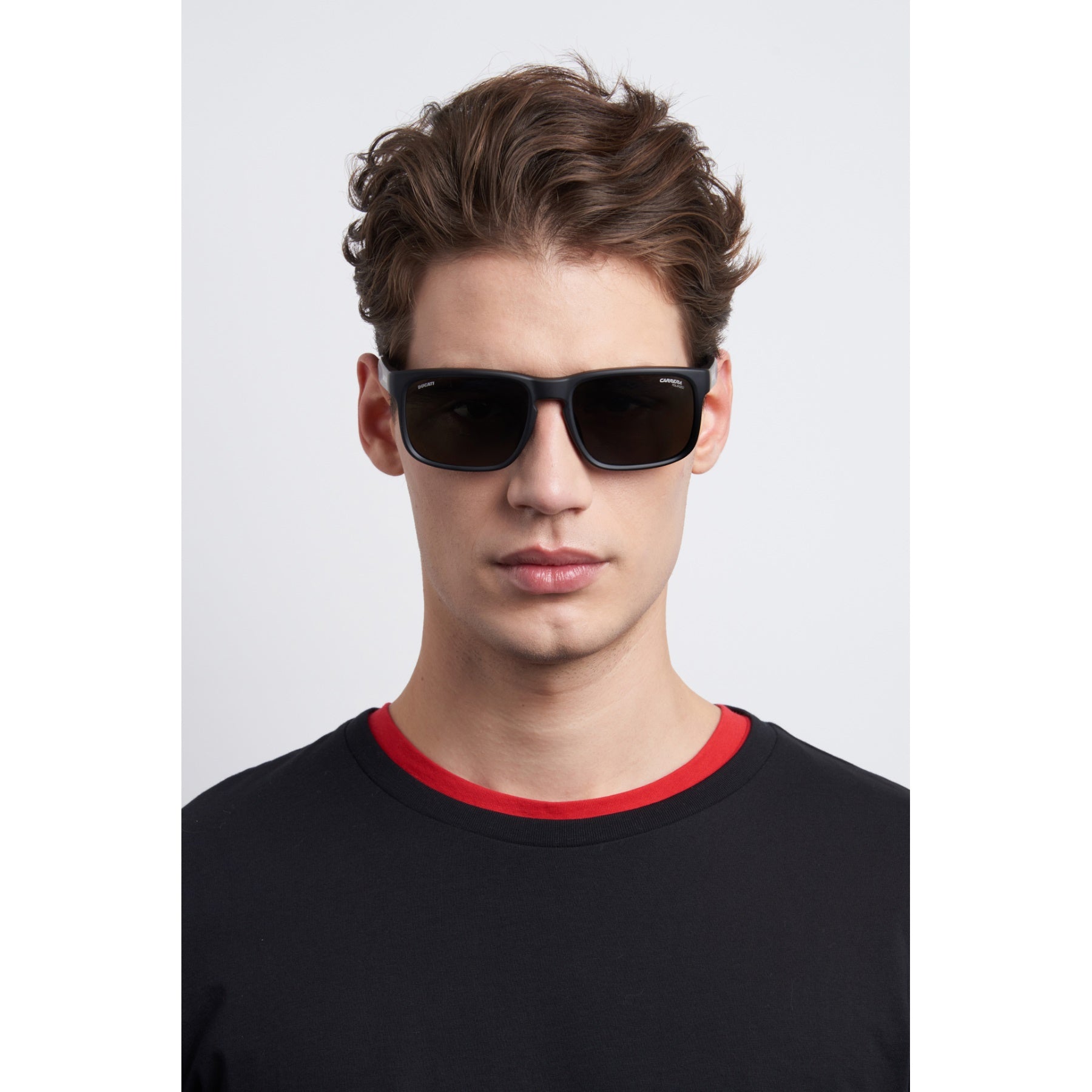 Born from the collaboration between Carrera and Ducati, these sunglasses combine aerodynamic shapes with sporty finishing touches. The square frame is reinforced with rubber panels and internal grips for a secure and stable fit, while the collection’s signature colorway means they're a collectible addition to the modern man’s wardrobe. Designed for a perfect fit under motorbike helmets, they boast the co-branded Carrera and Ducati styling to finish.