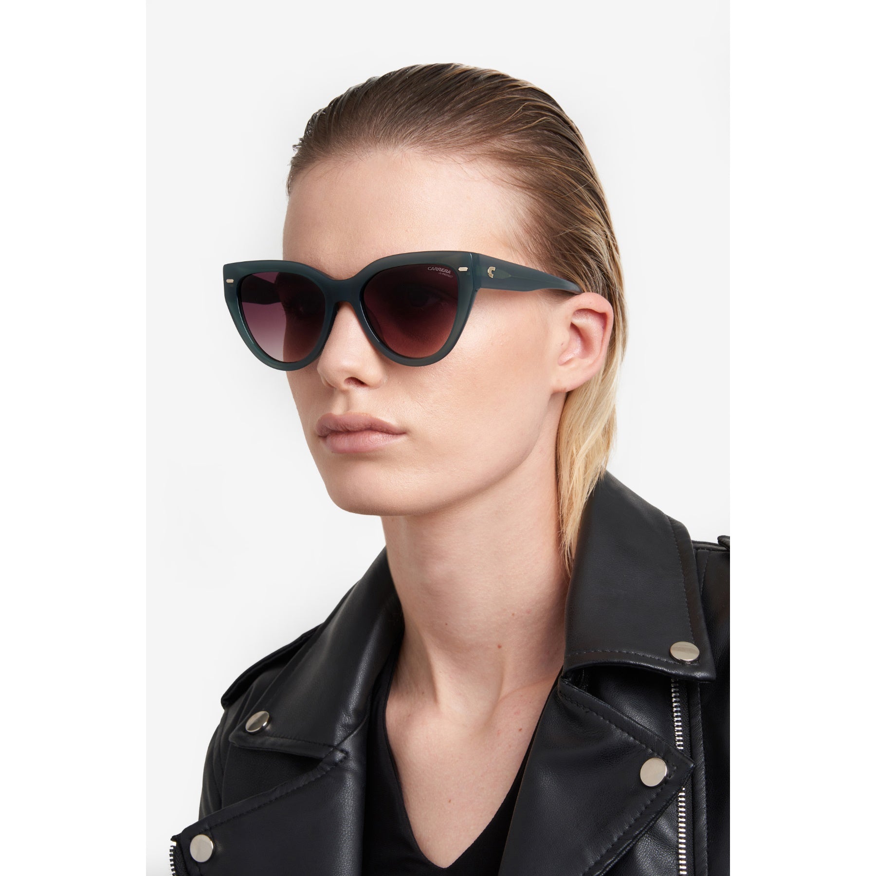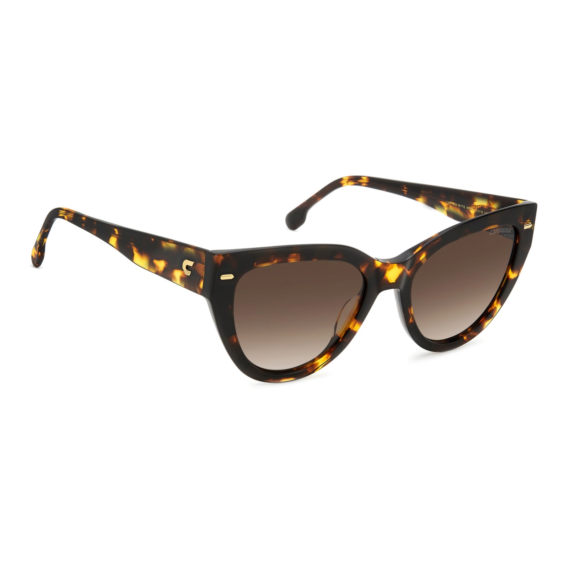 Carrera updates the most elegant eyewear shape, the cat eye, with these boldly proportioned sunglasses. Metal details shimmer on the acetate frames like small gems, including the frontal rivets and the iconic ‘C’ in relief on each temple. The gradient sun lenses, which are prescription-friendly, protect the eyes and face.