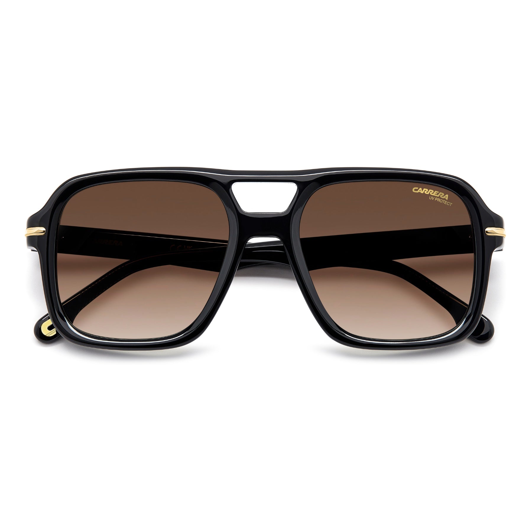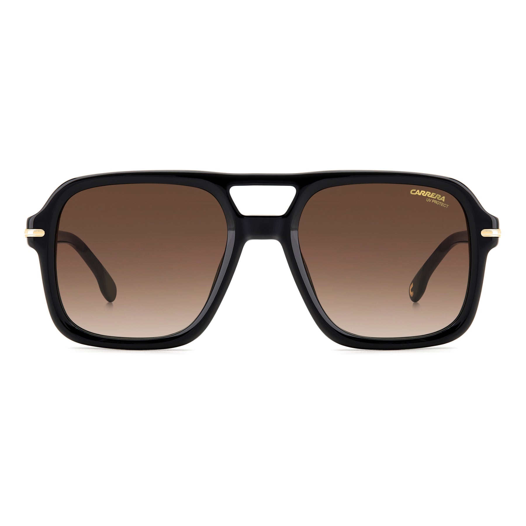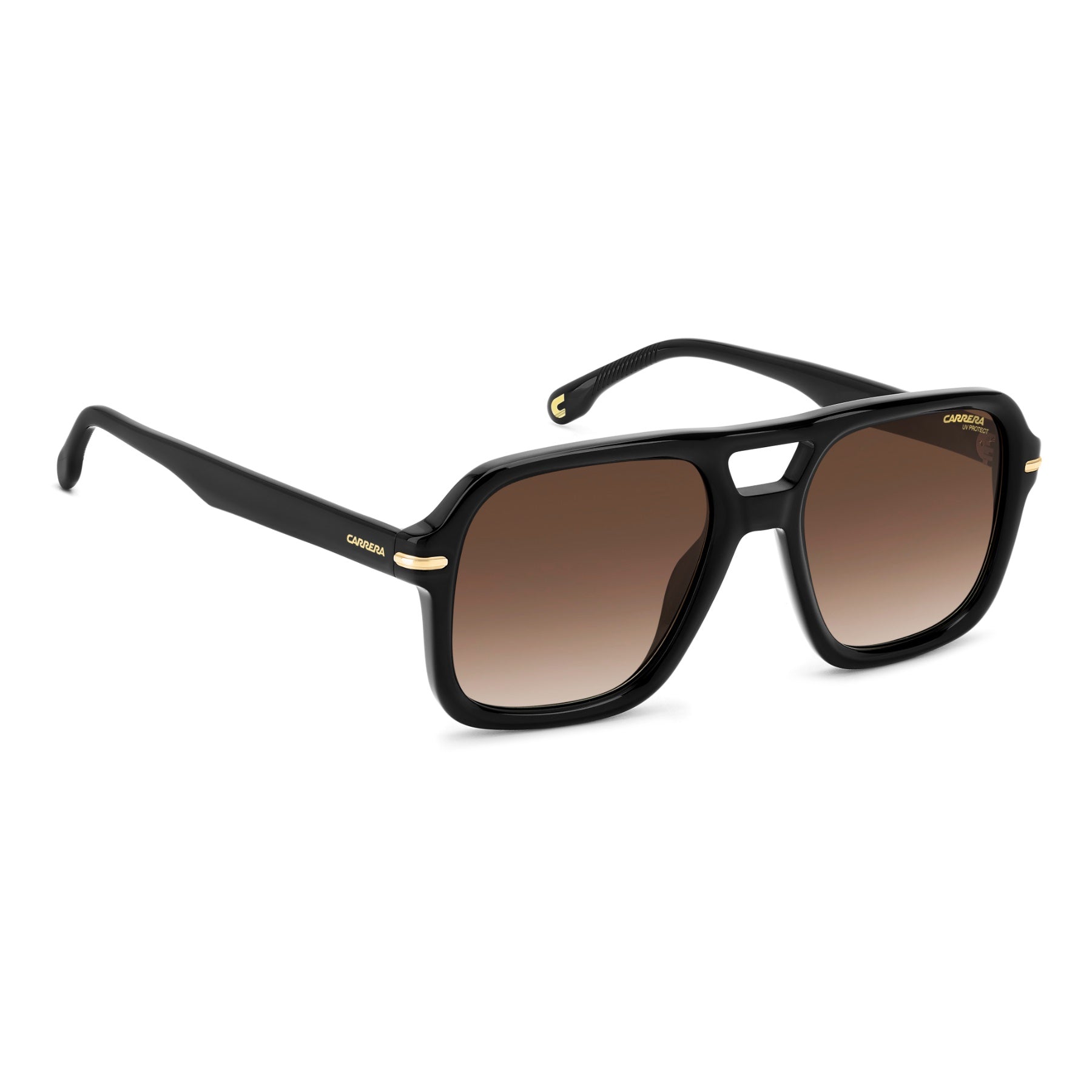 The spotlight is on these bold sunglasses with prominent, sculpted proportions. Embracing one of Carrera’s most popular styles (the double-bridge navigator), here the frames are in acetate with raised metal inserts at each side, complemented by slender temples. The colourways include a multi-layer option and transparent versions with a visible textural core. These glasses can be fitted with prescription lenses.