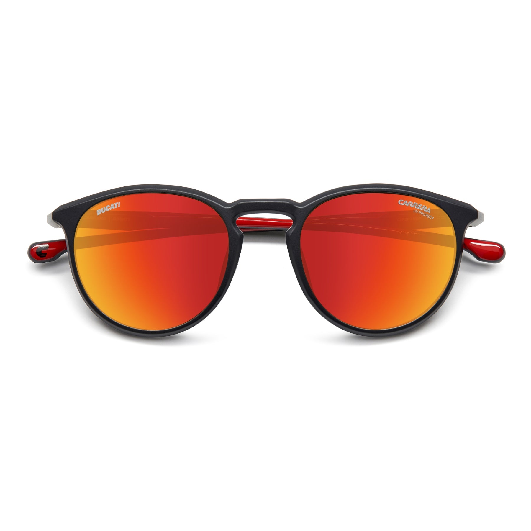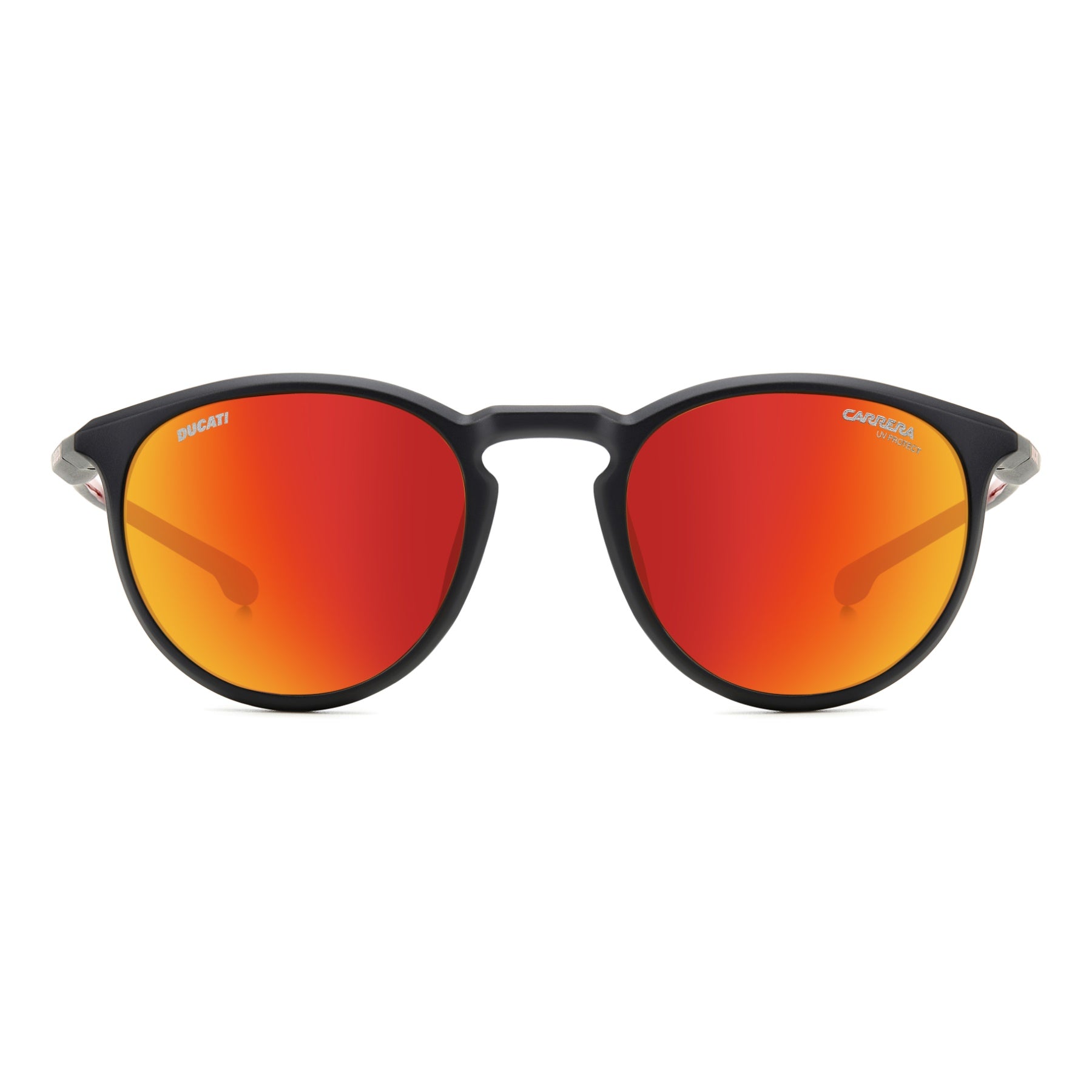 These sunglasses by Carrera | Ducati bring style to the racetrack. The pantos front with a keyhole bridge complements almost any face, even those of women who want to go bold with a sporty look. The temples are a tribute to the design of the Panigale, while the slender silhouettes and the shiny rubber end tips make these glasses ideal under a motorcycle helmet. Vision is optimised when they're fitted with prescription lenses, whether mirrored or polarized.