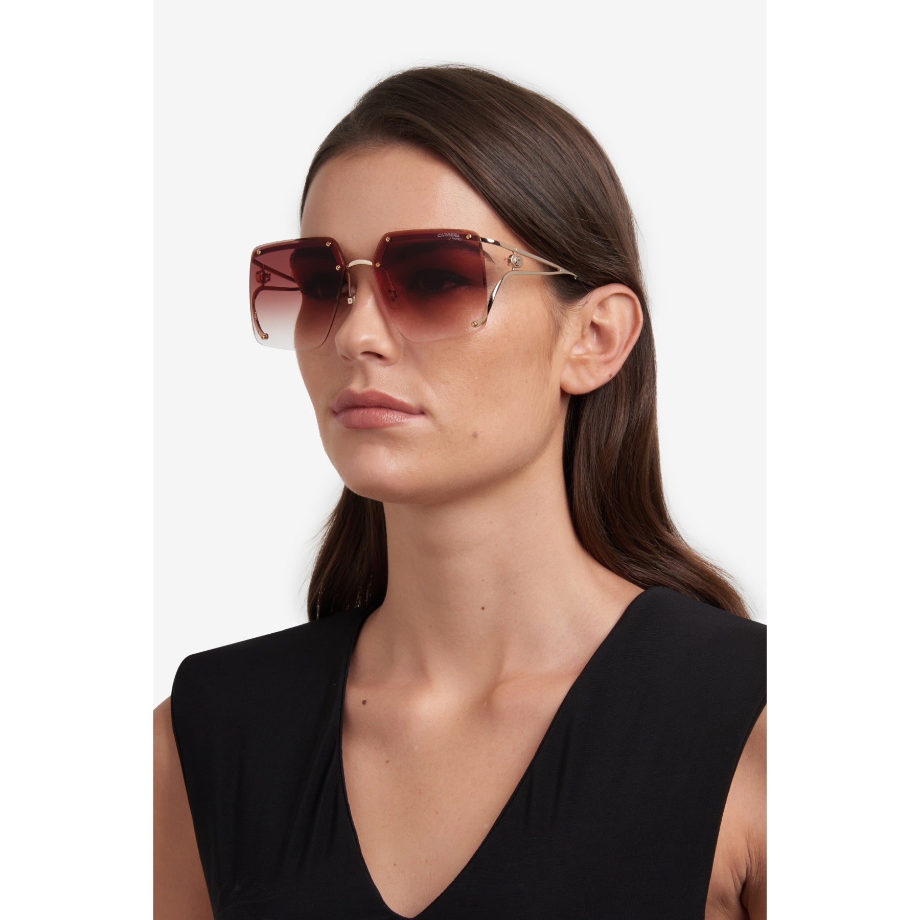 Carrera connoisseurs will adore these women's sunglasses. The rimless front, with colour-gradient lenses, is undeniably hypnotic, the star of any look. No detail has been left to chance: the screws that connect to the bridge and the temples are functional and decorative. The forked temple design, embellished by a suspended logo with an embossed ‘C’, is unforgettable. Sophisticated hues complete this unmistakably Carrera accessory.