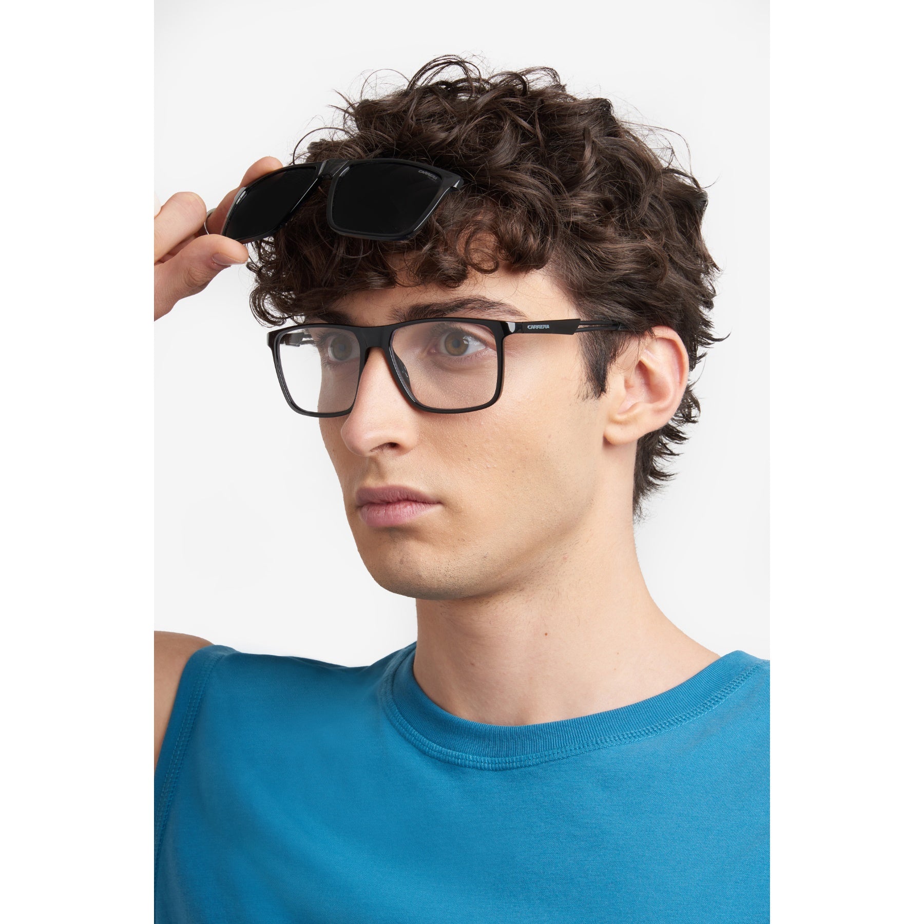 Carrera eyeglasses with clip-on sun lenses are an authentic embodiment of the athleisure trend. The frame is in polyamide, a high-performance material that’s known for being lightweight and long-lasting. The temples feature a distinctive opening in ultem, a non-deformable and lightweight material that’s on-tone with the logo. The frames are easily transformed into sunglasses: just attach the polarized sun lenses for maximum protection during the brightest hours of the day.