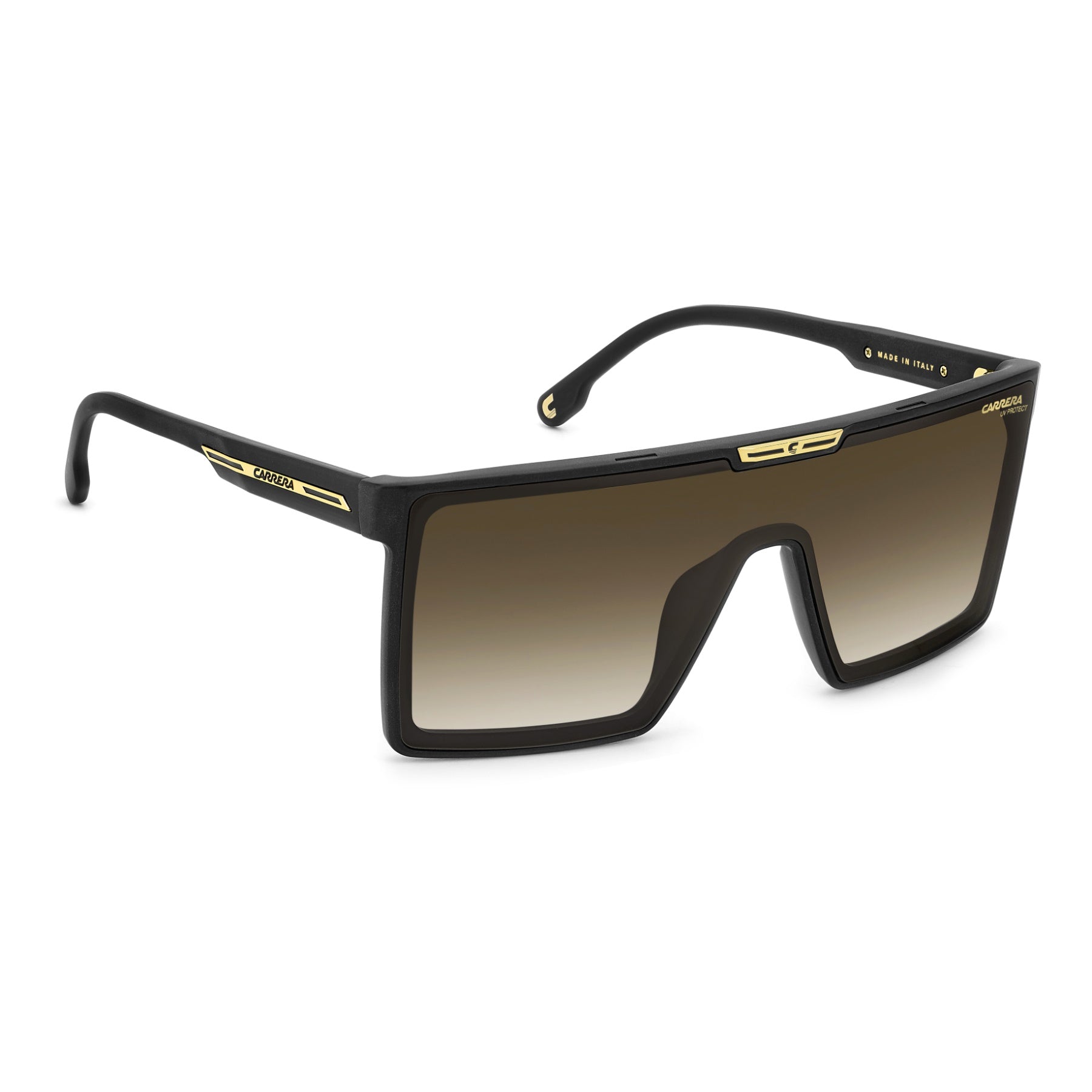 Carrera has transformed sunglasses into a true style statement. This pair is made in Italy, as attested to by the inscription on the inner temple, proof of Carrera’s commitment to quality. The shield frames have a futuristic aesthetic, crowned by the undeniably engaging horizontal ‘C’ logo plaque at the top. The metal detail with the Carrera flag is also echoed on the temples, which narrow slightly around the ears, to complete this unparalleled accessory.