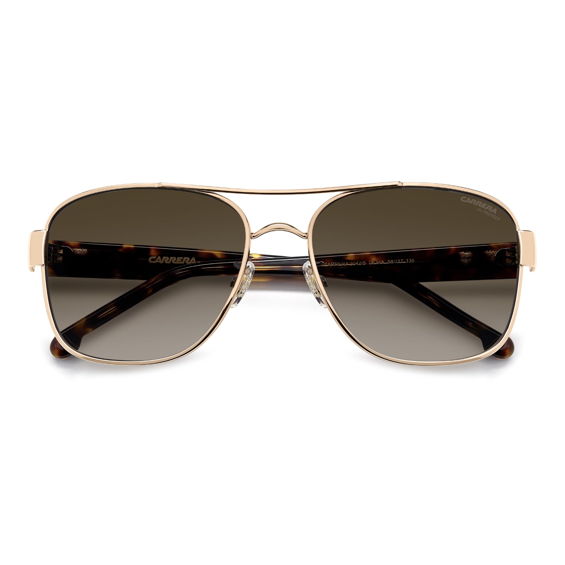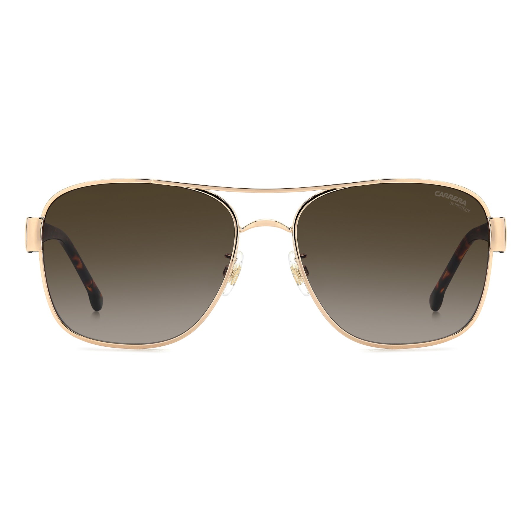 These Carrera women's sunglasses instantly bring incomparable style to any ensemble. The eyes are protected by the full-coverage front, with rims in different tones of gold united by a double bridge. A style to wear well beyond the sunniest hours of the day, especially when fitted with prescription lenses, these frames are extra stable thanks to adjustable nose pads. They also come in a version with multi-layer temples, or with polarized lenses.