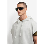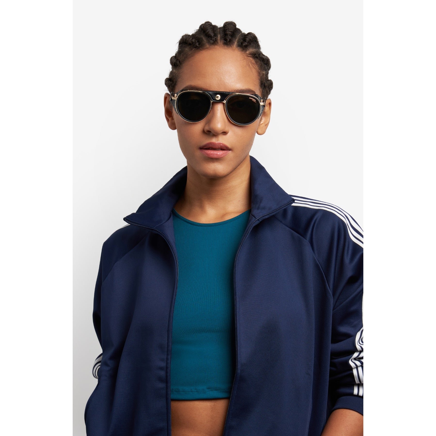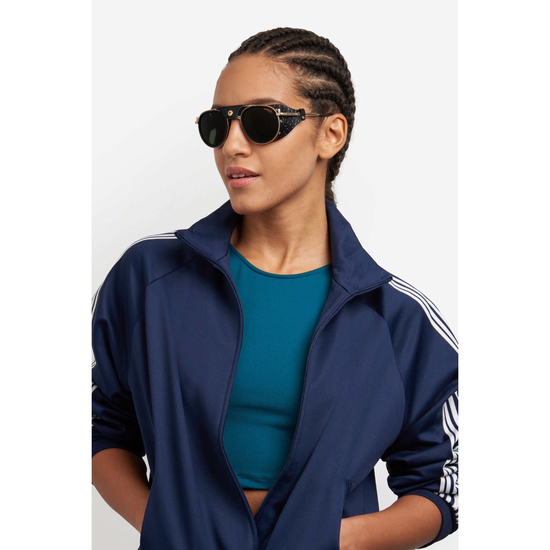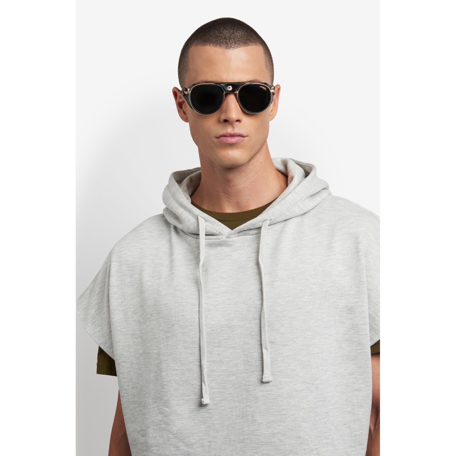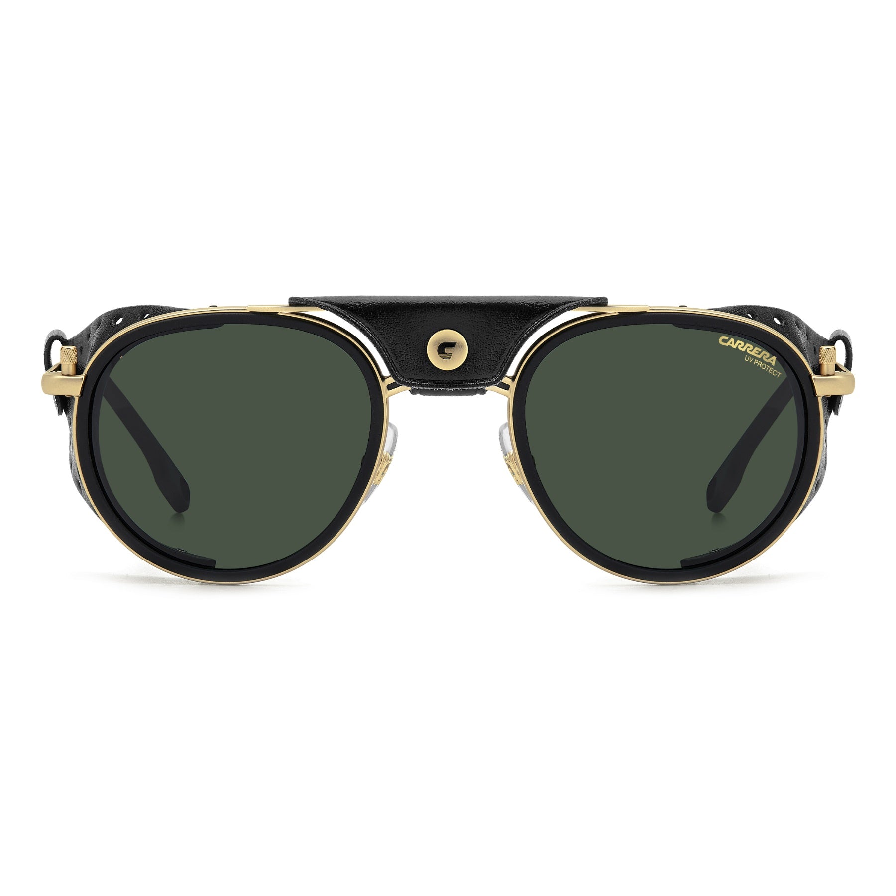 These Carrera sunglasses were inspired by Alpine landscapes. The metal structure is accompanied by detachable faux leather elements on the sides and double bridge which protect from the light and wind. The end tips can be adjusted, remaining solidly in place thanks to their curved shape. Dedicated openings make it possible to attach an elastic cord which can be purchased separately, so as not to lose them on the most arduous climbs. This style is available in mirrored or photochromic lens versions.