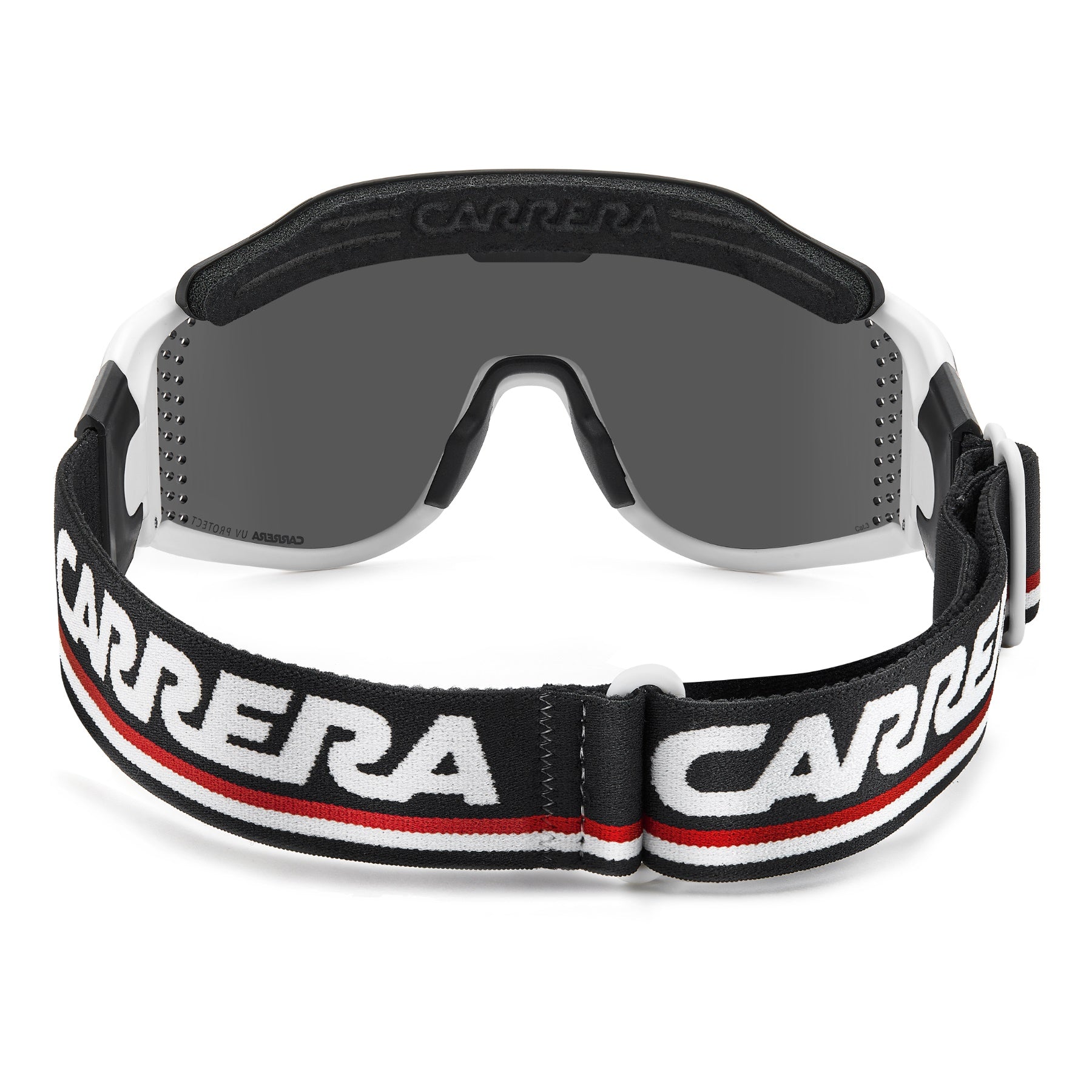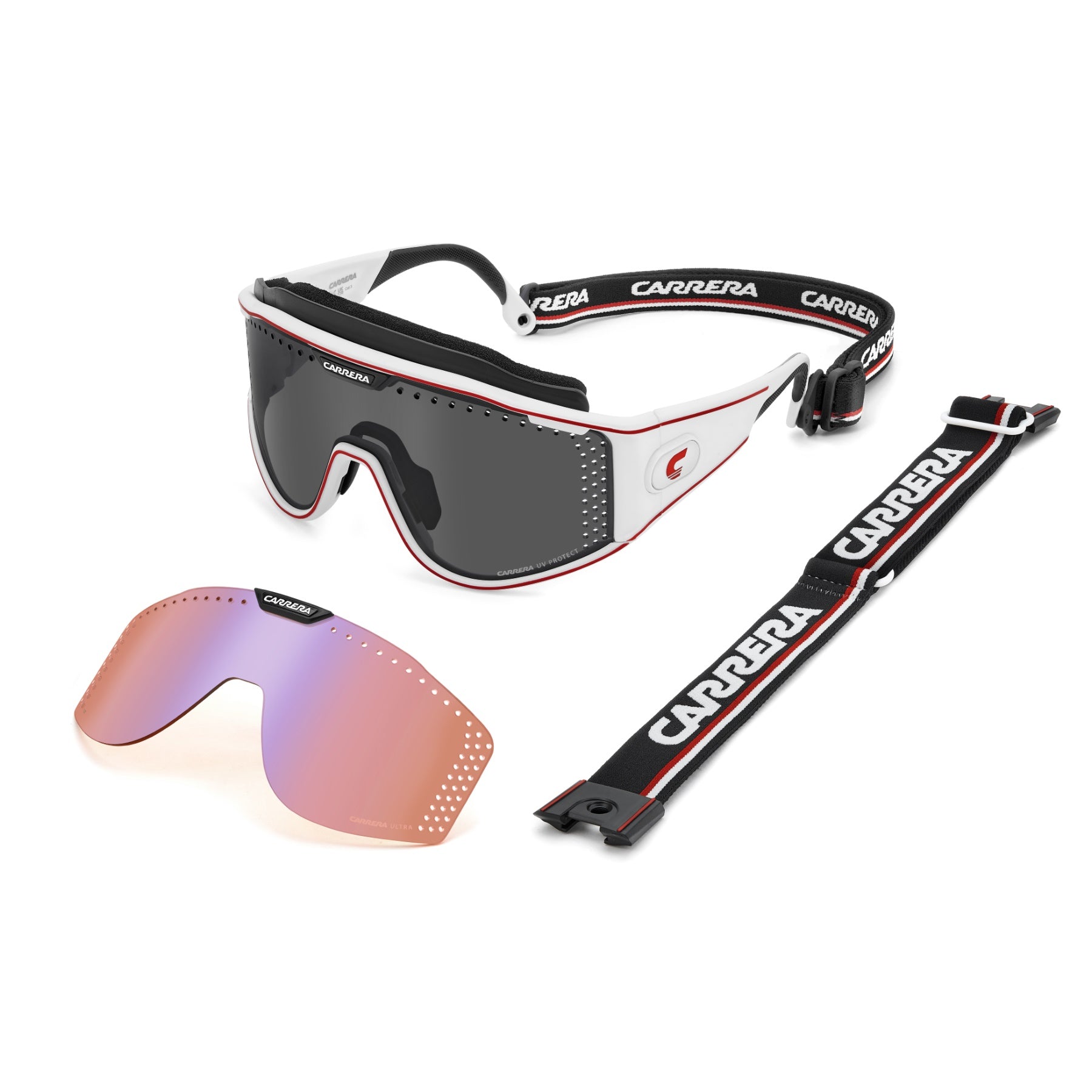 These special-edition Carrera sunglasses feature a shield front with air holes, celebrating the brand's sporty heritage. An innovative magnetic system lets you remove the temples and replace them with a branded elastic band, transforming this iconic style into snow goggles. Two lenses with different technologies can be easily interchanged thanks to Carrera's patented Boombox system, all included in the complete pack.
